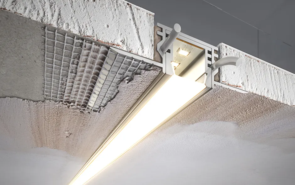 Алюминиевый профиль-держатель для профиля PDS-S. Встраивается в гипсокартон любой толщины, фланцы под штукатурку. Поставляется со вставкой из пены и 2х силиконовым фикс.шнуром. Размеры: высота 13мм, ширина с фланцем 49мм, основание (паз для установки) 22мм. Длина 2000мм. Цена за 1м.
