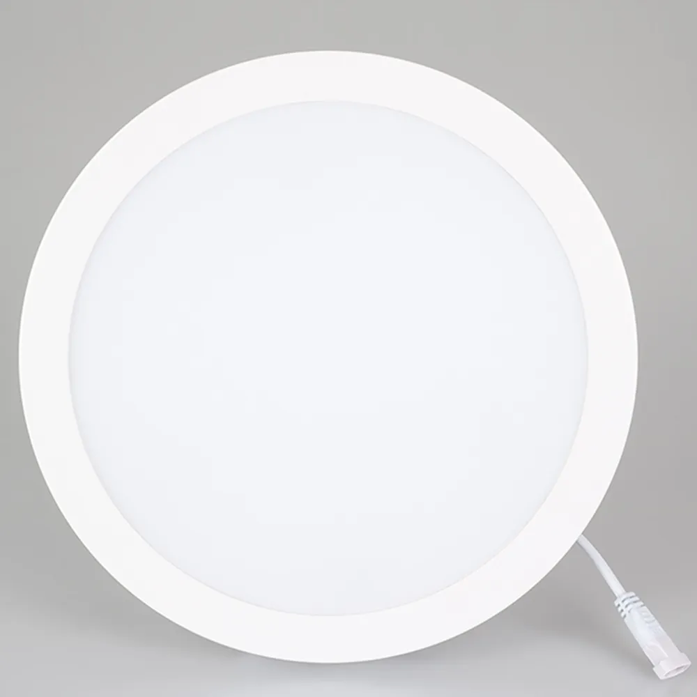 Светодиодная панель 24Вт, корпус белый IP40, круглый. Цвет ТЕПЛЫЙ БЕЛЫЙ 3000K, св.поток 1920-2160лм, CRI(Ra)>80, угол 100°. Размер Ф225x26 мм, установка в отверстие 205 мм. Питание AC 180-240V, 24Вт, DC600mA 36...44V, драйвер в комплекте.