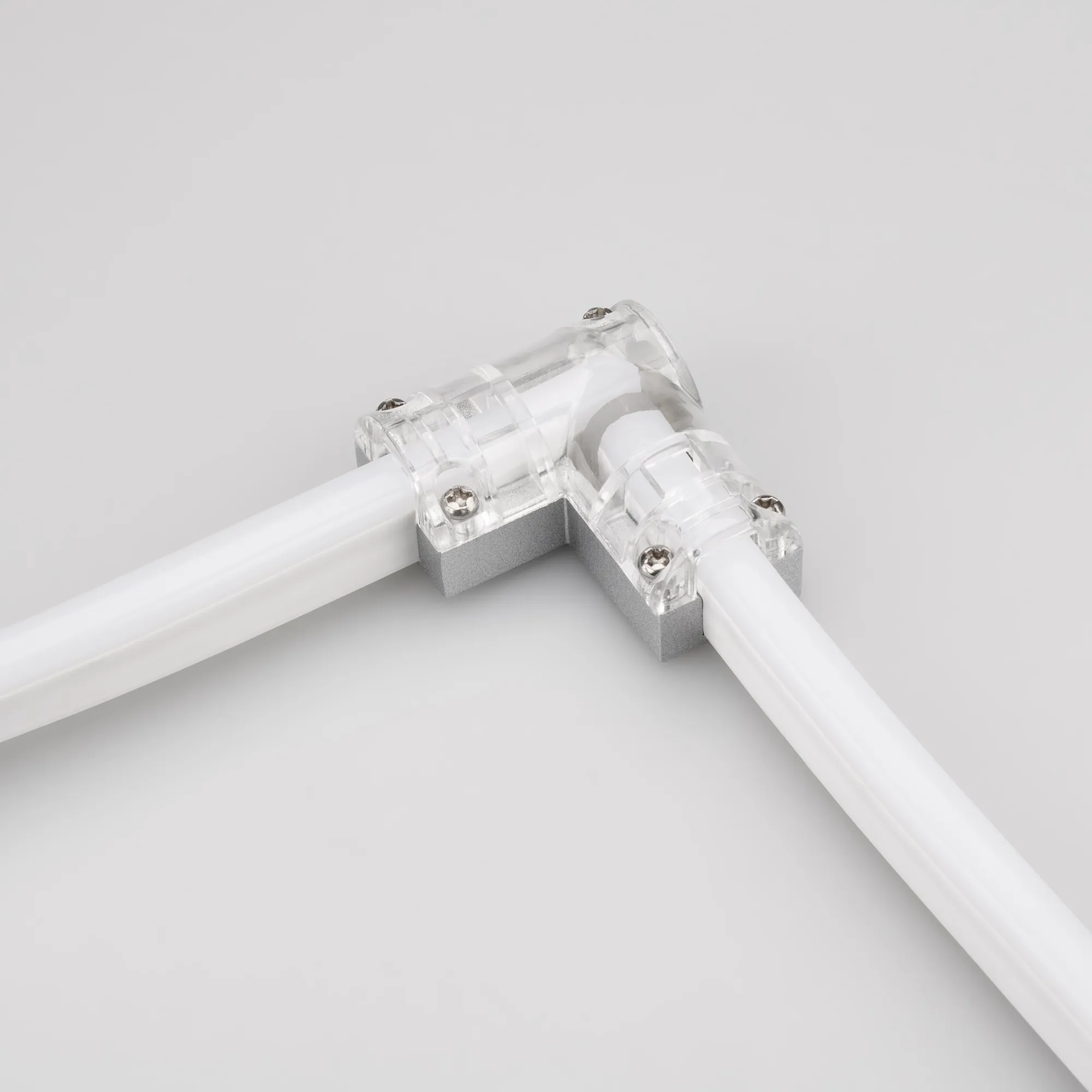Угловой 2-х контактный соединитель для гибкого неона сечения 16x8mm серии NEON. Обеспечивает непрерывное соединение и сплошную линию свечения без разрывов. Требуется доп.герметизация для соединения IP65. Материал-алюминий, прозрачный пластик. Размеры ДхШ: 48х41мм. Цена за 1шт.