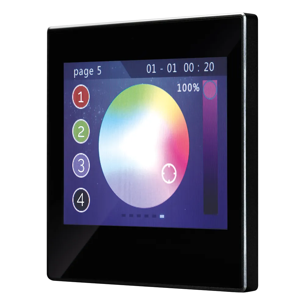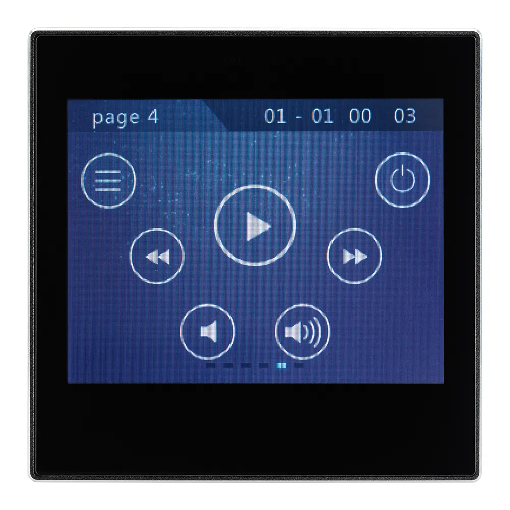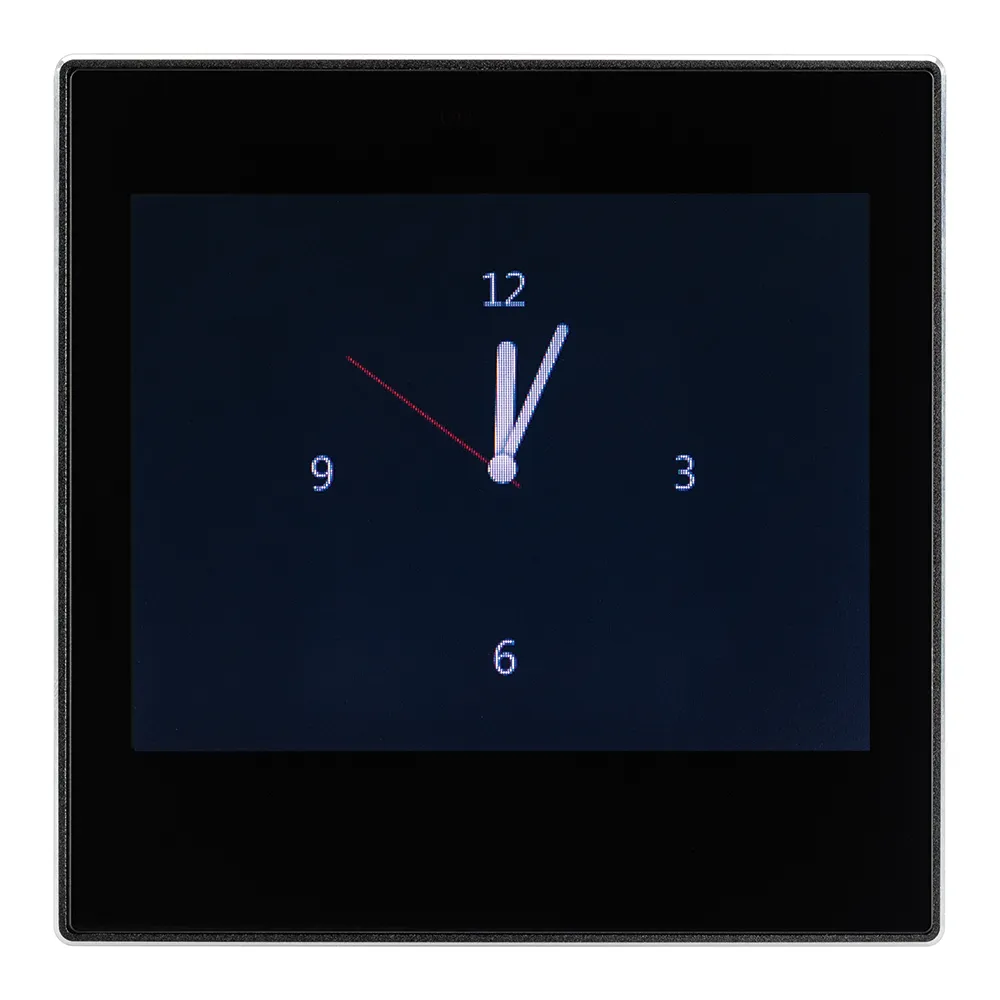 Многофункциональная встраиваемая настенная панель стандарта KNX с цветным сенсорным дисплеем 3,5”. Требуется дополнительное питание AUX DC 21-30V. Размер 86x86x23.5 мм.