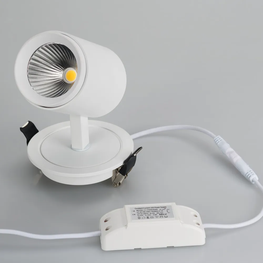 Встраиваемый поворотный светильник для потолка. Светодиод 9W, цвет БЕЛЫЙ 6000K, св.поток 600лм, угол 25°, RA>80. Корпус белый. Мощность 9Вт, питание AC180-240V. Размеры ØDxLxH 62x91x95мм. Установка в отверстие 80мм. Драйвер в комплекте (30-45V 200mA).