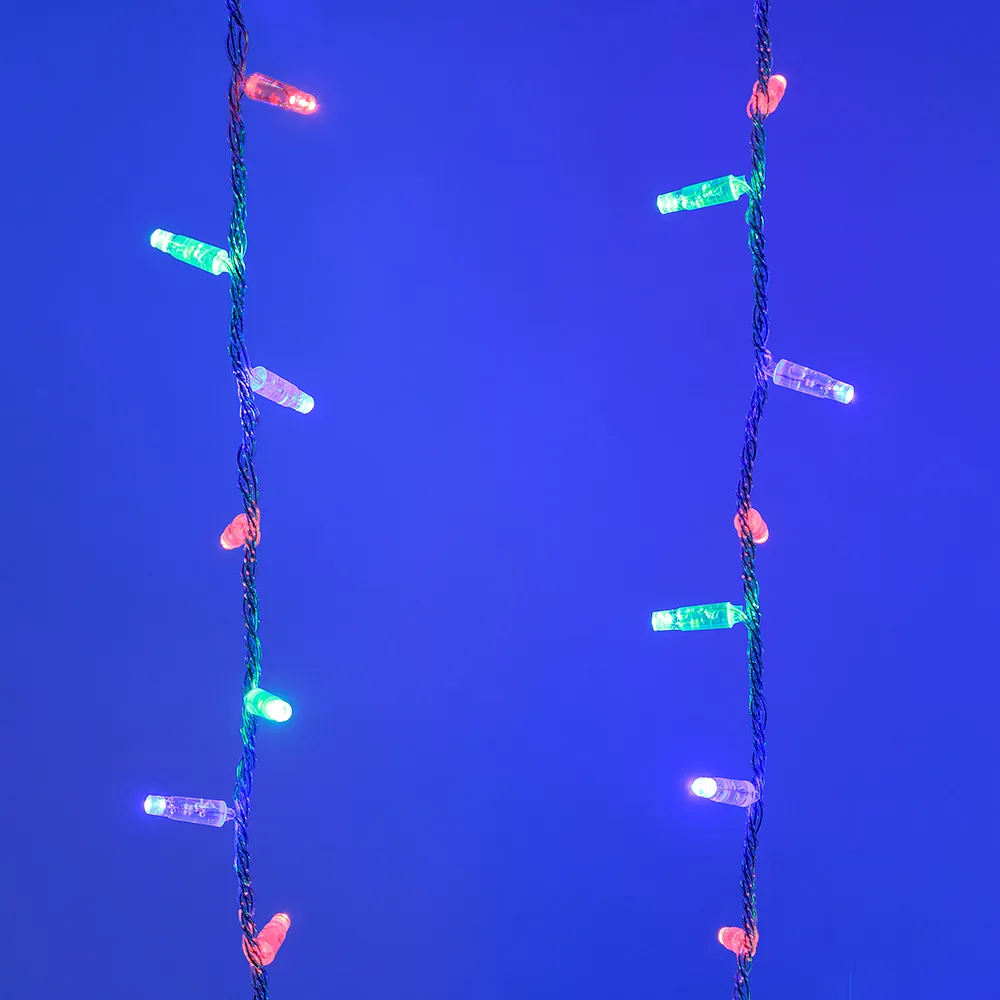 Светодиодный Занавес Classic. Размер 2000x2500 мм (длина 2000 мм, высота 2500 мм). 9 ниспадающих нитей длиной 2500 мм. 405 светодиода размером 7 мм. Цвет свечения RGBY, (цвет светодиодов чередуется), постоянное свечение и 8 динамических эффектов с резким световым рисунком (прозрачная вогнутая линза). Провод прозрачный, ПВХ. Питание 230 В, Мощность 81 Вт, защита IP65, применение в помещении и на улице под навесом. Аксессуар для подключения и выбора режима свечения в комплекте.