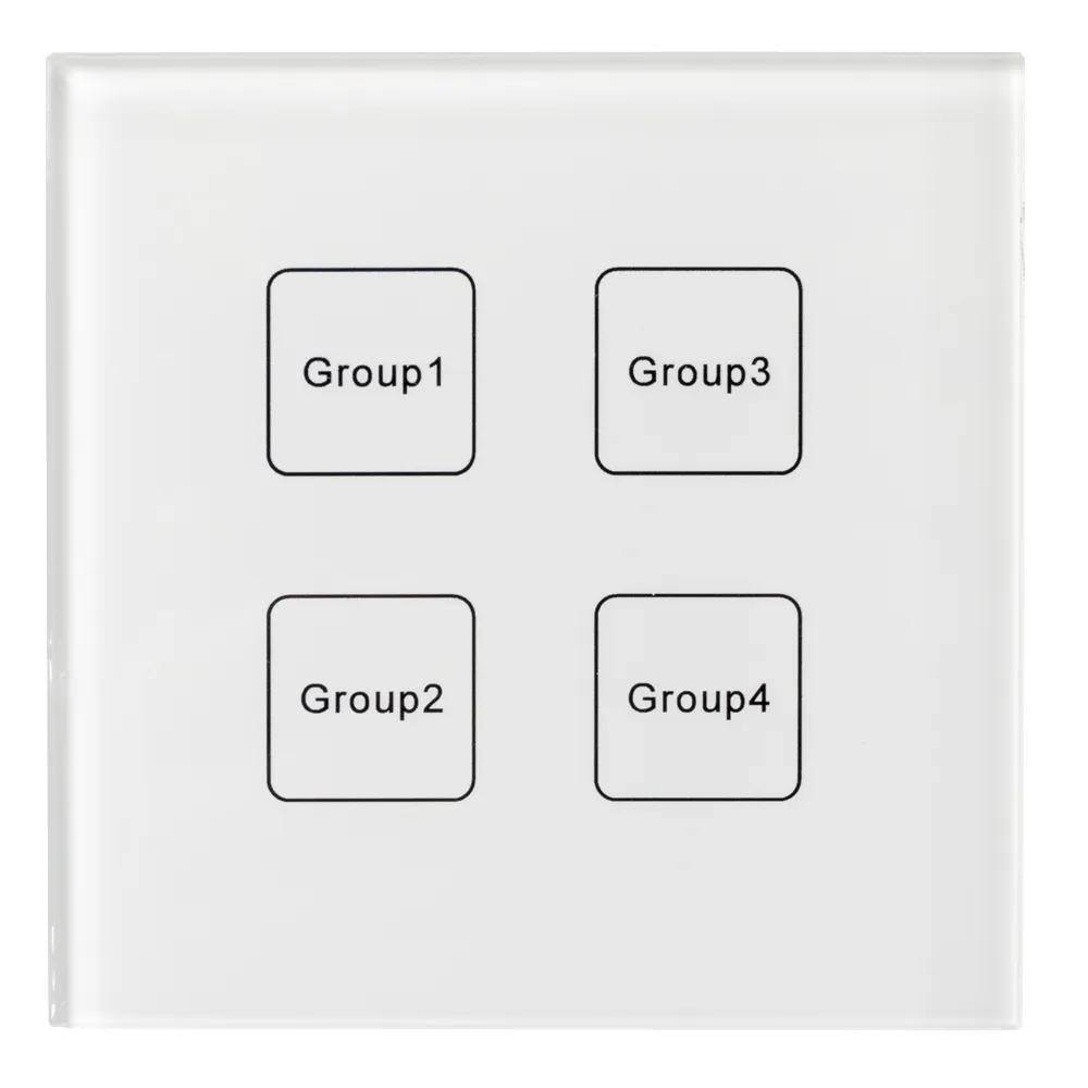 Встраиваемая сенсорная панель с выходом DALI. 4 кнопки, 4 группы. Каждой кнопкой выполняется включение, выключение и диммирование по соответствующей ей группе. Установка стартового номера группы выполняется переключателями на корпусе. Питание от шины DALI (4 мА). Заменяется на 037194.