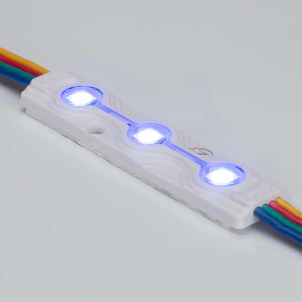 Герметичный светодиодный модуль IP67, RGB, напряжение 12 В, мощность 0.72 Вт, 3 светодиода SMD 5050, угол 120°. 20 шт на проводе, расстояние между центрами модулей 175 мм, длина провода между модулями 109 мм, рекомендуемая глубина установки 50–150 мм. Размер 66х15x4.9 мм. Гарантия 3 года.