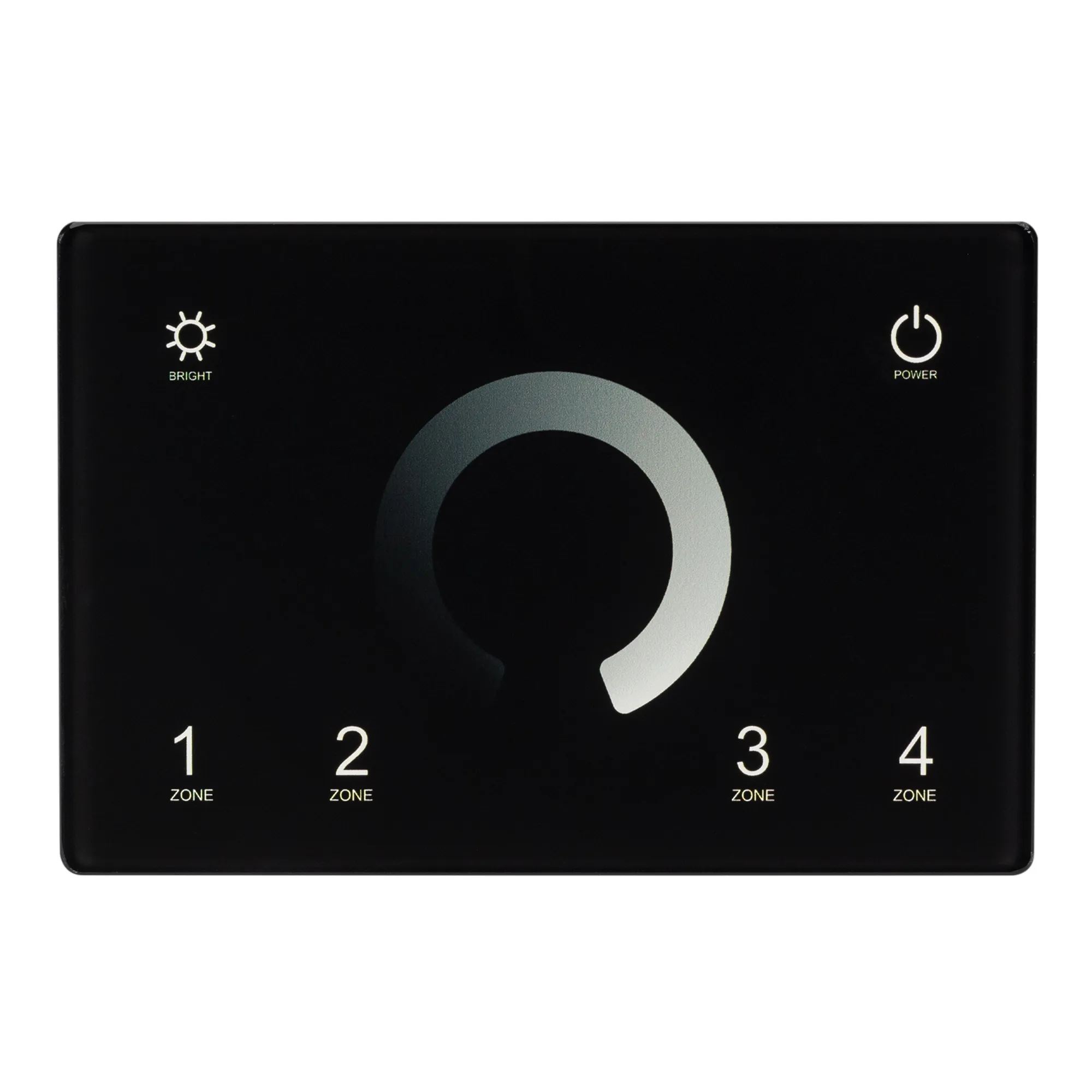 Встраиваемая сенсорная панель 2.4 ГГц, цвет чёрный. Итальянский стандарт. Материал - стекло. Для управления одноцветными источниками света (ШИМ), 4 зоны управления. Функция управления DMX512 устройствами. Питание/рабочее напряжение AC 85-265V. Габариты 120х80х37 мм, устанавливается в стандартный подрозетник. Панель совместима с диммерами серии SMART.