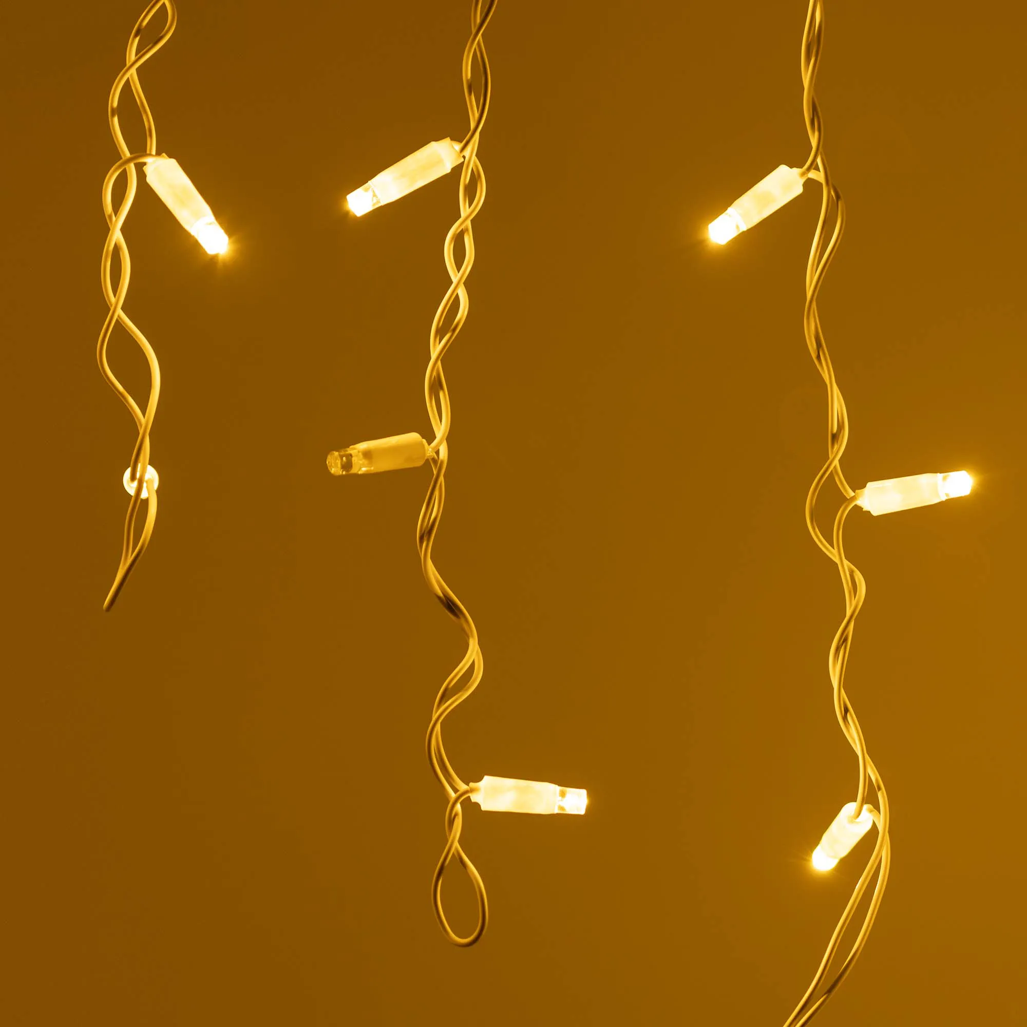 Светодиодная бахрома Classic. Размер 2400 мм (длина 2400 мм, по длине 24 нити высотой 200/600 мм). Количество светодиодов 88 шт размером 7 мм. Основной цвет свечения ТЕПЛЫЙ БЕЛЫЙ (3000 К), эффект мерцания редких точек (ТЕПЛЫЙ БЕЛЫЙ 3000К) с резким световым рисунком (прозрачная вогнутая линза), соотношение светодиодов: 66 теплых постоянного свечения / 12 теплых с мерцанием. Провод белый, ПВХ. Питание 230 В, Мощность 6 Вт, защита IP65, применение на улице под навесом. Аксессуары для подключения приобретаются отдельно.