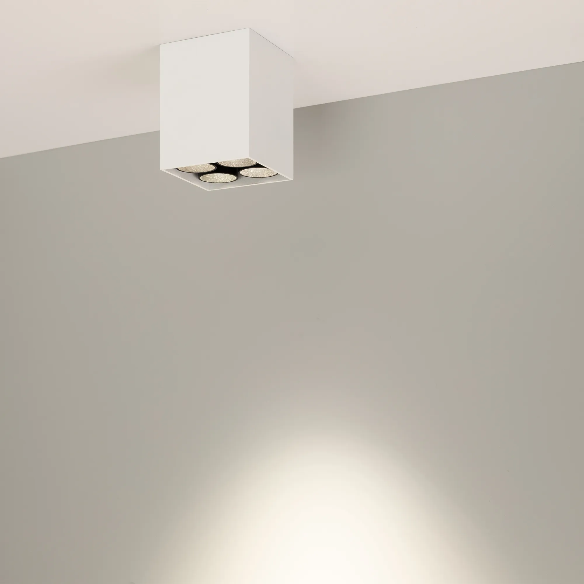 Накладной интерьерный светильник. Мощность 10 Вт, св. поток 634 лм, 64 лм/Вт, дневной 4000 K, CRI>98, угол 30°, напряжение питания 230 В. Белый квадратный корпус из алюминия, степень защиты IP20. Размер: длина 65 мм, ширина 65 мм, высота 85 мм. Монтаж накладной. Драйвер 12.9 В, 700 мА, пульсация <5%.