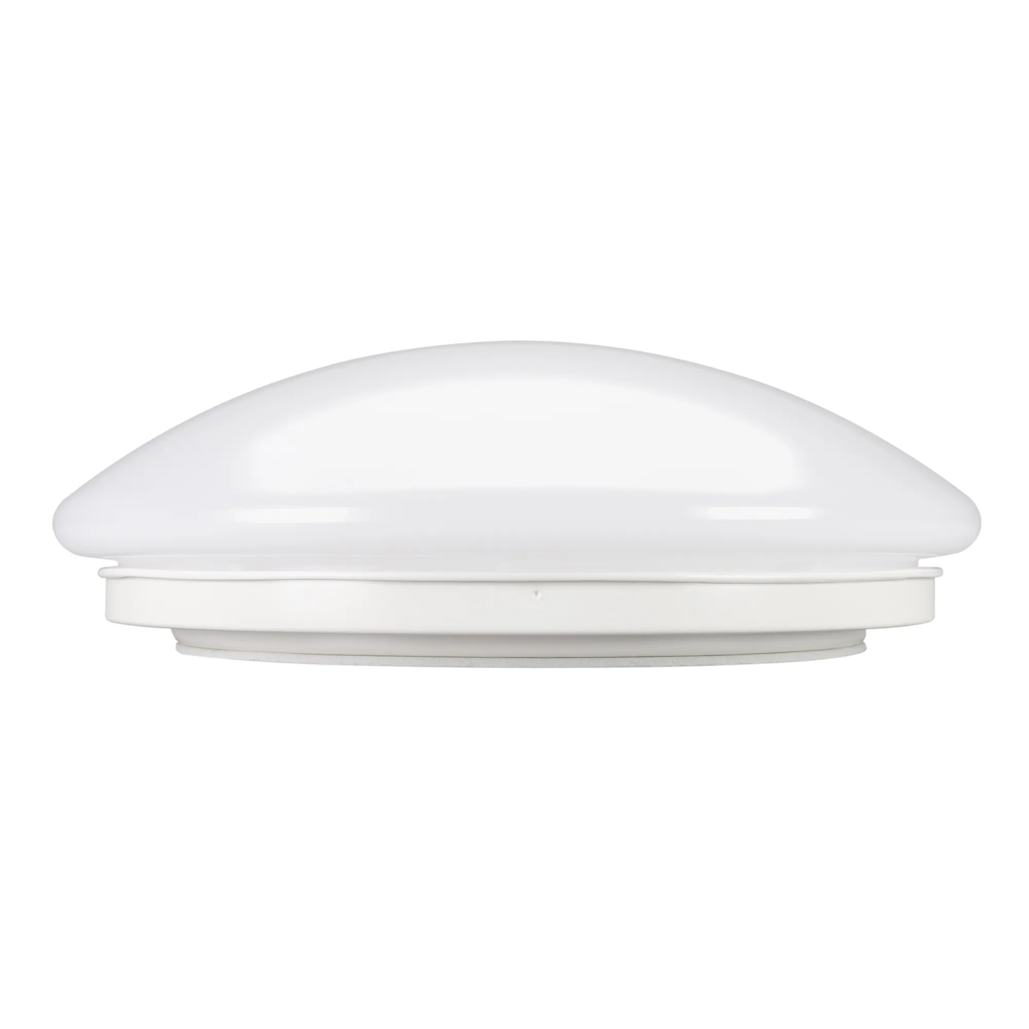 Накладной светильник. Мощность 12Вт, св. поток 850 лм, 70лм/Вт, теплый 3000 K, CRI>80, угол 120°, напряжение питания 230 В. Круглый пластиковый корпус, плафон пластик, степень защиты IP44. Размер: диаметр 280 мм, высота 100 мм. Монтаж накладной. Драйвер встроенный, пульсация <5%.