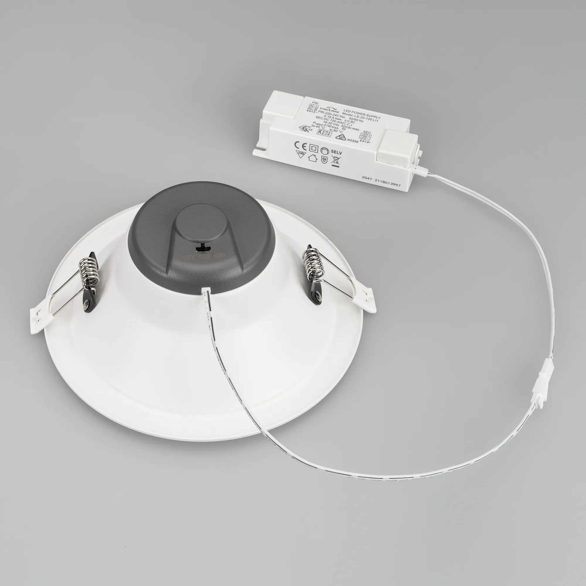 Светильник даунлайт с изменяемой цветовой температурой и переключателем на корпусе. Мощность 20 Вт, св. поток 2439-2517 лм, 100 лм/Вт, белый 6000К, или дневной 4000К, или теплый 3000К (выбор цвета свечения при установке, фиксированный), CRI>80, угол 80°, напряжение питания 230 В. Белый круглый корпус из алюминия, степень защиты IP20. Размер: диаметр 174 мм, высота 72 мм. Монтаж встраиваемый, установочное отверстие: диаметр 145-155 мм. Драйвер 18-30 В, 700 мА, пульсация <0,7%.