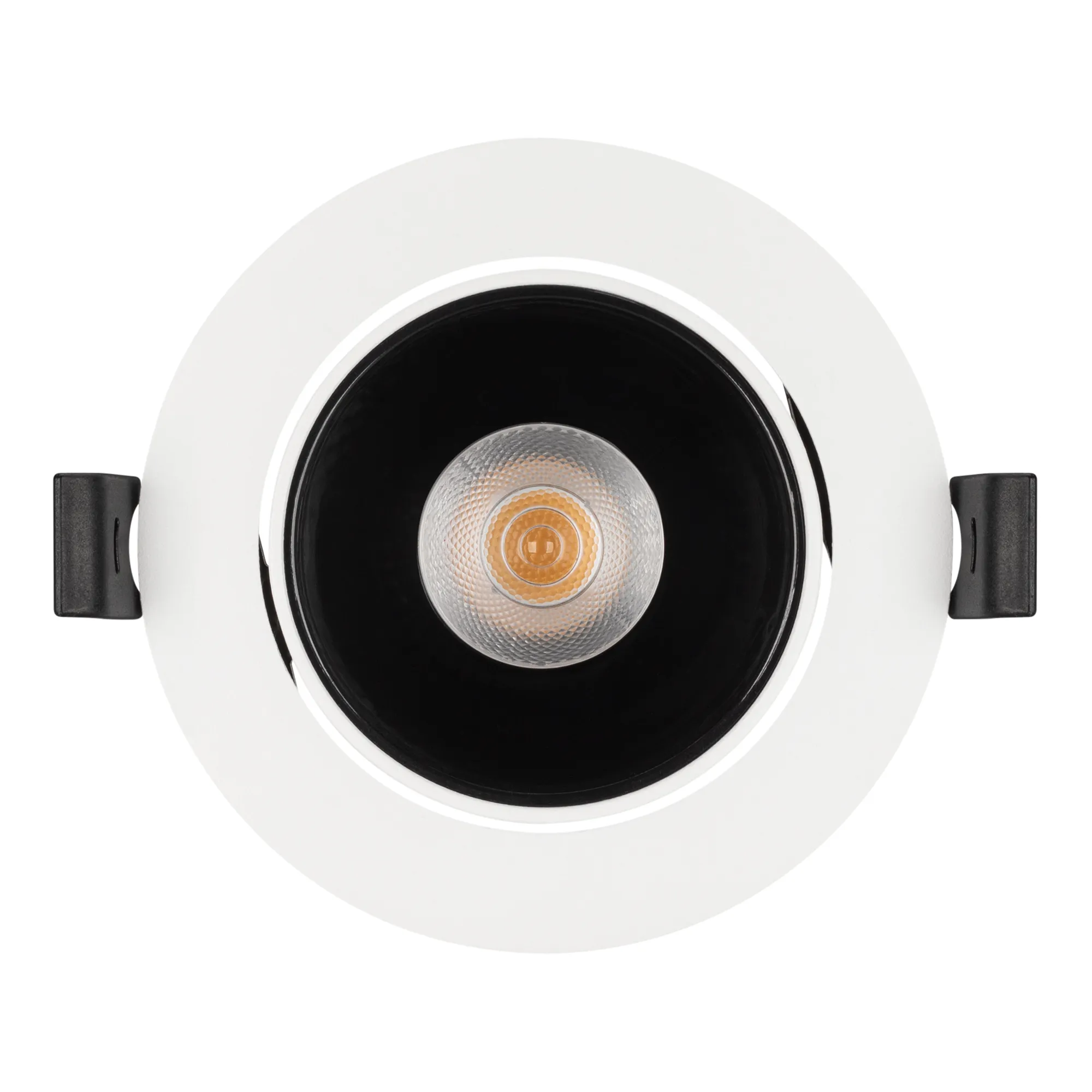 Встраиваемый поворотный светильник даунлайт. Мощность 12 Вт,св. поток 910 лм, 76 лм/Вт, дневной 4000 K, CRI>90, UGR<16, угол 32°, напряжение питания 230 В. Белый круглый корпус из алюминия, черный ГЛЯНЦЕВЫЙ отражатель из PMMA, степень защиты IP20. Размер: диаметр 102 мм, высота 70 мм. Монтаж встраиваемый, установочное отверстие: диаметр 95 мм. Драйвер 20-40 В, 300 мА, пульсация <2%.