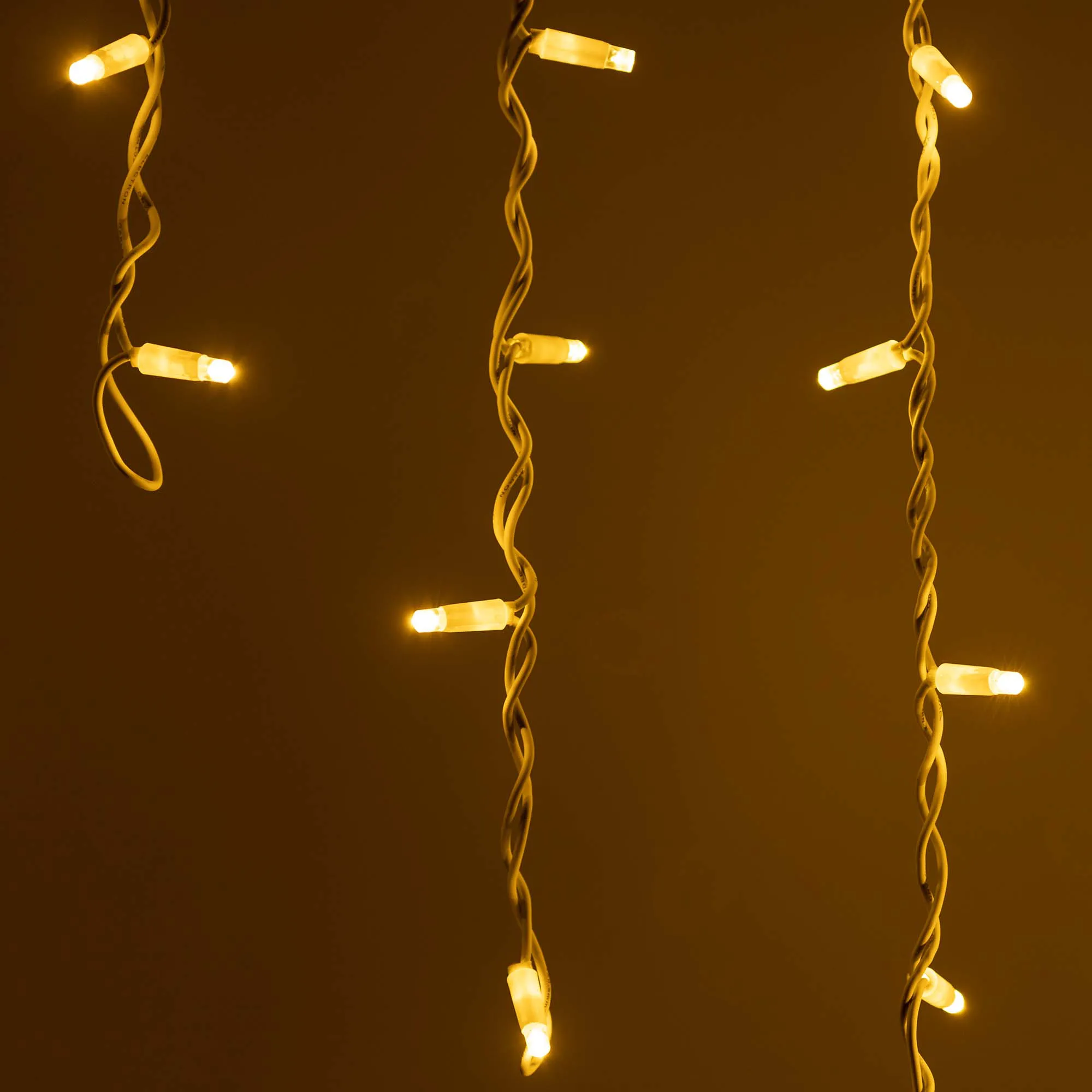 Светодиодная бахрома Classic. Размер 4000 мм (длина 4000 мм, по длине 32 нити высотой 200/600 мм). Количество светодиодов 128 шт размером 7 мм. Основной цвет свечения ТЕПЛЫЙ БЕЛЫЙ (3000 К), эффект мерцания редких точек ТЕПЛЫЙ БЕЛЫЙ (3000К) с мягким световым рисунком (выпуклая молочно-белая линза), соотношение светодиодов: 106 теплых постоянного свечения / 22 белых с мерцанием. Эффект частого мерцания. Провод белый, каучук. Питание 230 В, Мощность 6 Вт, защита IP65, применение на улице под навесом. Аксессуары для подключения приобретаются отдельно.