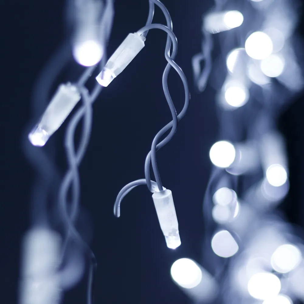 Светодиодная бахрома Pro. Размер 4000 мм (длина 4000 мм, по длине 32 нити высотой 200/600 мм). Количество светодиодов 128 шт размером 7 мм. Основной цвет свечения БЕЛЫЙ (6000 К), эффект мерцания редких точек БЕЛЫЙ (6000К) с мягким световым рисунком (выпуклая молочно-белая линза), соотношение светодиодов: 106 теплых постоянного свечения / 22 белых с мерцанием. Эффект частого мерцания. Провод белый, каучук. Питание 230 В, Мощность 6 Вт, защита IP65, применение на улице под навесом. Аксессуары для подключения приобретаются отдельно.