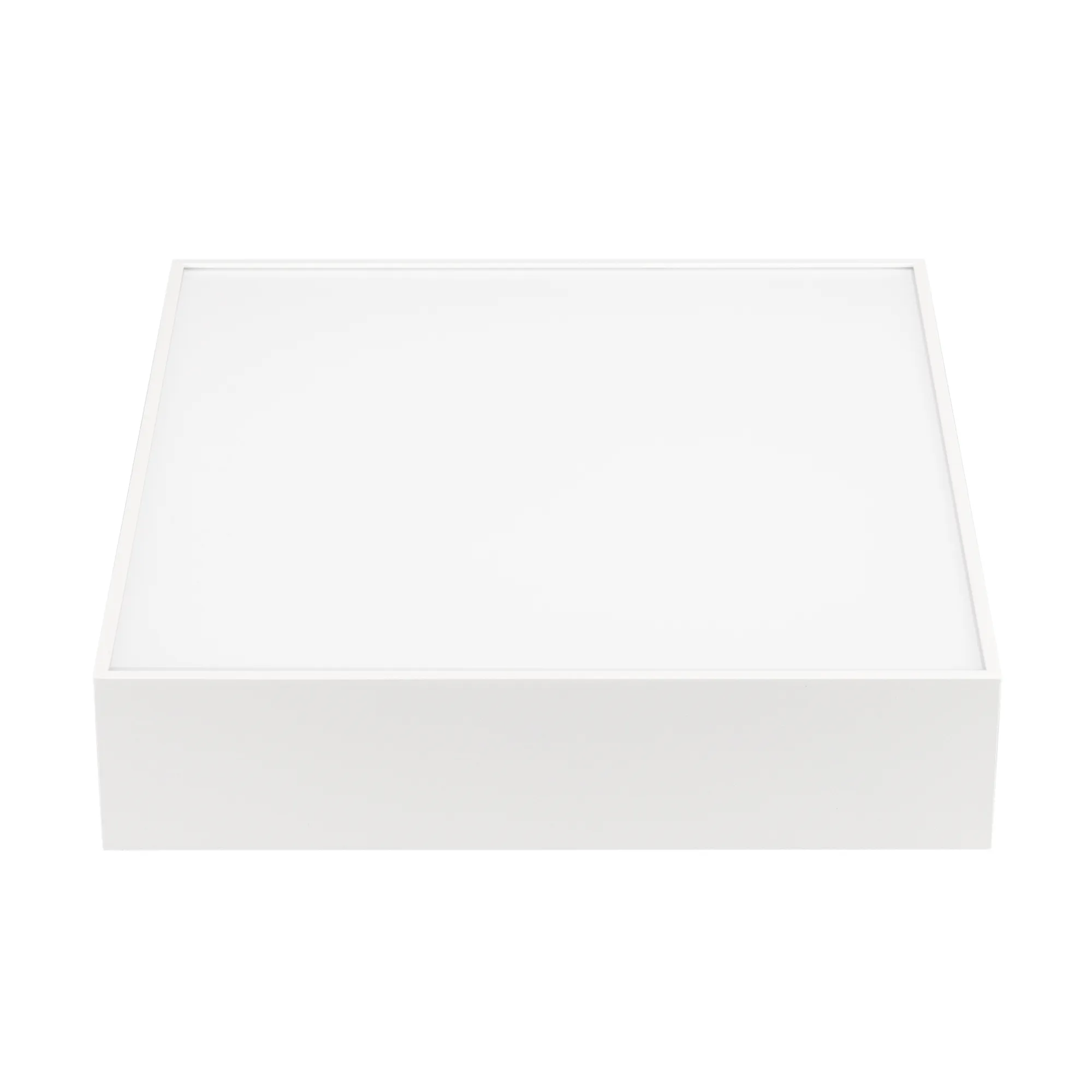 Накладной светильник. Мощность 25 Вт, св. поток 1440-1900 лм, 76 лм/Вт, дневной 4000 K, CRI>90, угол 120°, напряжение питания 230 В. Белый квадратный корпус из алюминия, экран PC, степень защиты IP40. Размер: длина 250 мм, ширина 250 мм, высота 59 мм. Монтаж накладной. Драйвер 27-45 В, 600 мА, пульсация <5%.