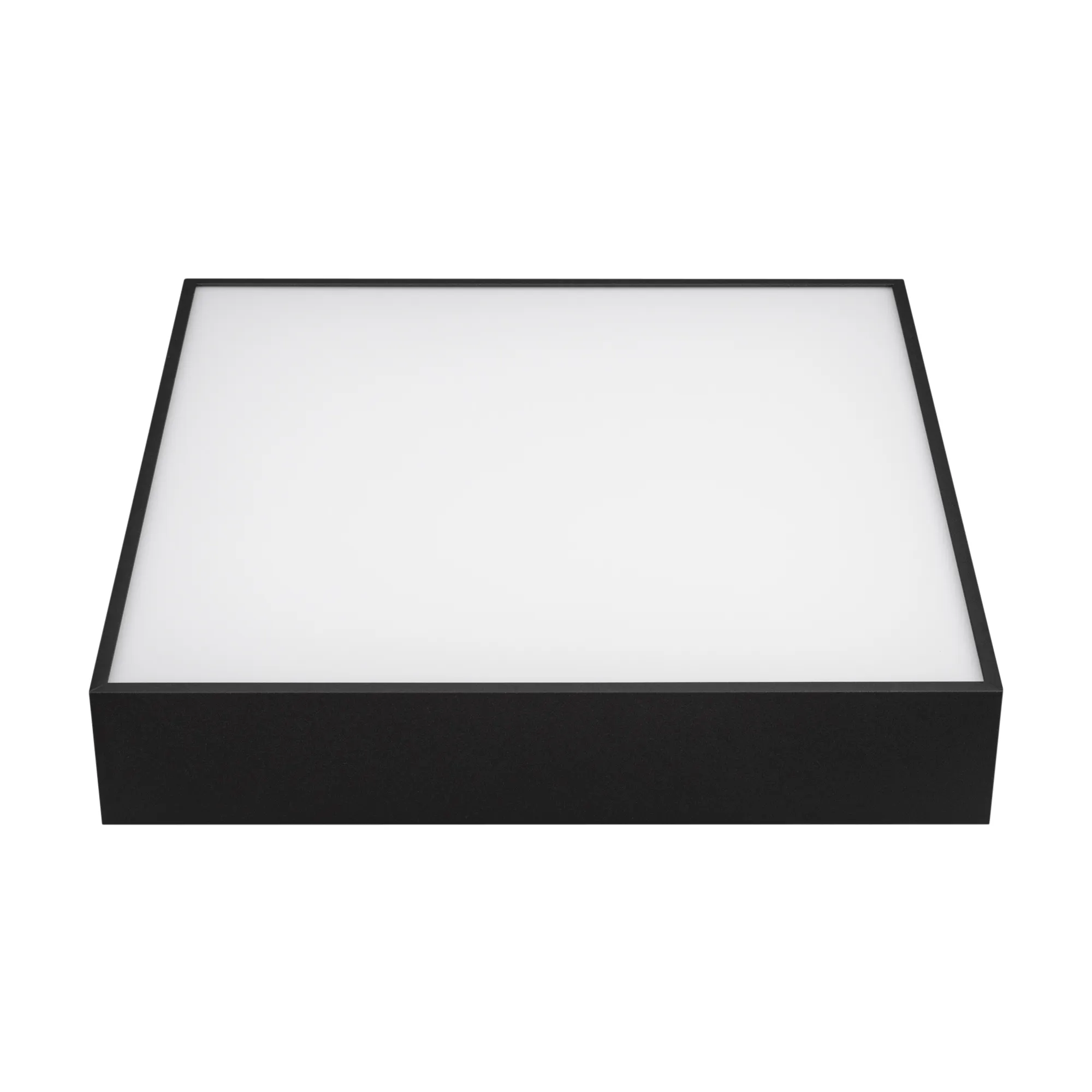 Поставка под заказ от 100 шт. Накладной светильник. Мощность 30 Вт, св. поток 2000-2540 лм, 85 лм/Вт, дневной 4000 K, CRI>90, угол 120°, напряжение питания 230 В. Черный квадратный корпус из алюминия, экран PC, степень защиты IP40. Размер: длина 350 мм, ширина 350 мм, высота 64 мм. Монтаж накладной. Драйвер 27-42 В, 800 мА, пульсация <5%.