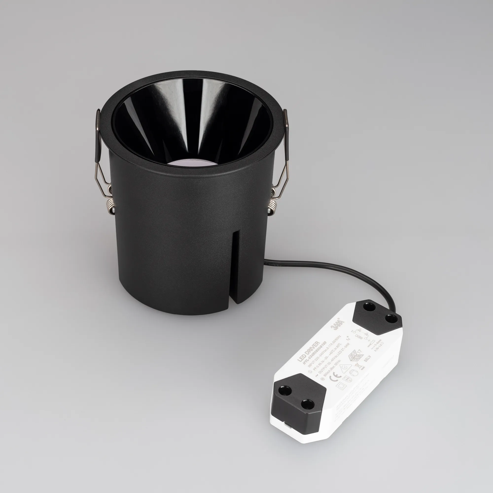 Встраиваемый светильник даунлайт. Мощность 32.8 Вт, св. поток 3280 лм, 100 лм/Вт, дневной 4000 K, CRI>90, UGR<16, угол 30°, напряжение питания 230 В. Черный круглый корпус из алюминия, черный ГЛЯНЦЕВЫЙ отражатель из PMMA, степень защиты IP20. Размер: диаметр 112 мм, высота 114 мм. Монтаж встраиваемый, установочное отверстие: диаметр 105 мм. Драйвер 32-40 В, 850 мА, пульсация <2%.