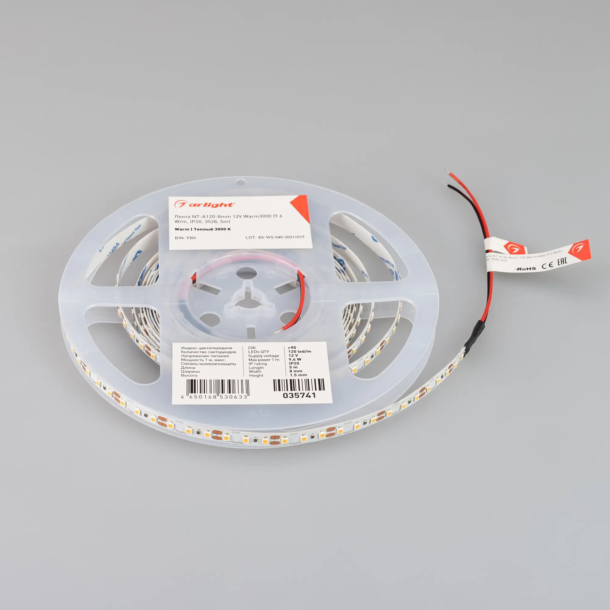 Лента светодиодная NT-A120-8mm 12V Warm3000 (9.6 W/m, IP20, 3528, 5m) (Arlight, 9.6 Вт/м, IP20)
