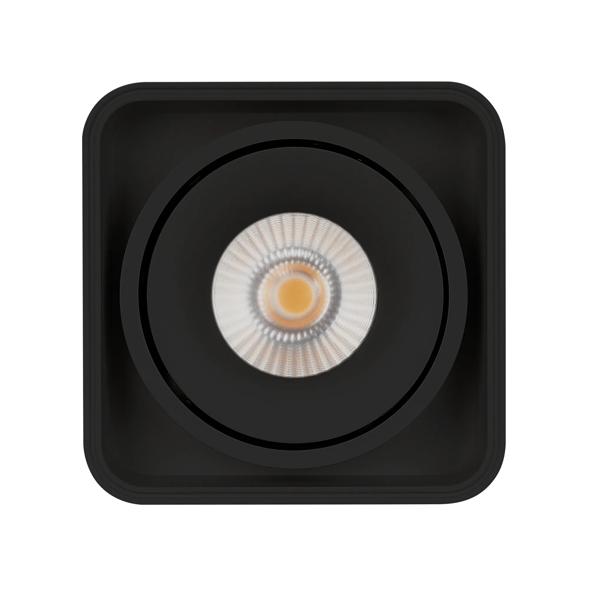 Накладной интерьерный светильник. Мощность 8 Вт, св. поток 760 лм, 98 лм/Вт, дневной 4000 K, CRI>90, угол 45°, регулируемое направление луча 30°, напряжение питания 230 В. Черный квадратный корпус из алюминия, степень защиты IP20. Размер: длина 100 мм, ширина 100 мм, высота 100 мм. Монтаж накладной. Драйвер 24-42 В, 200 мА, пульсация <1%.