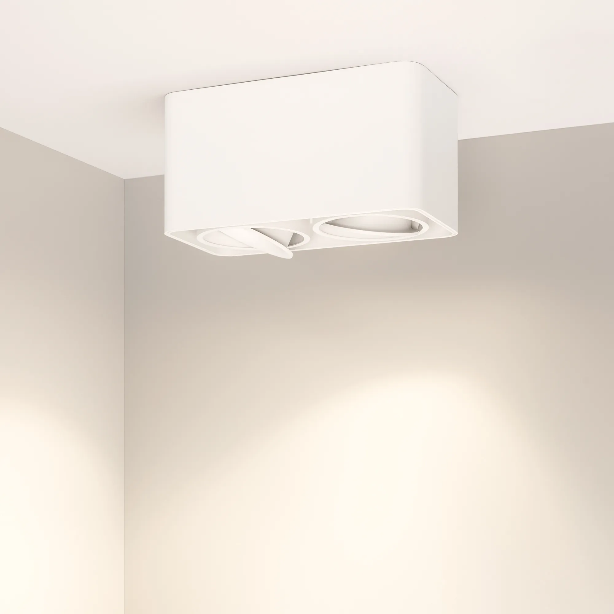Поставка под заказ от 100 шт. Накладной интерьерный светильник. Мощность 16 Вт, св. поток 1490 лм, 98 лм/Вт, теплый 3000 K, CRI>90, угол 45°, регулируемое направление луча 30°, напряжение питания 230 В. Белый квадратный корпус из алюминия, степень защиты IP20. Размер: длина 195 мм, ширина 100 мм, высота 100 мм. Монтаж накладной. Драйвер 26-40 В, 400 мА, пульсация <5%.