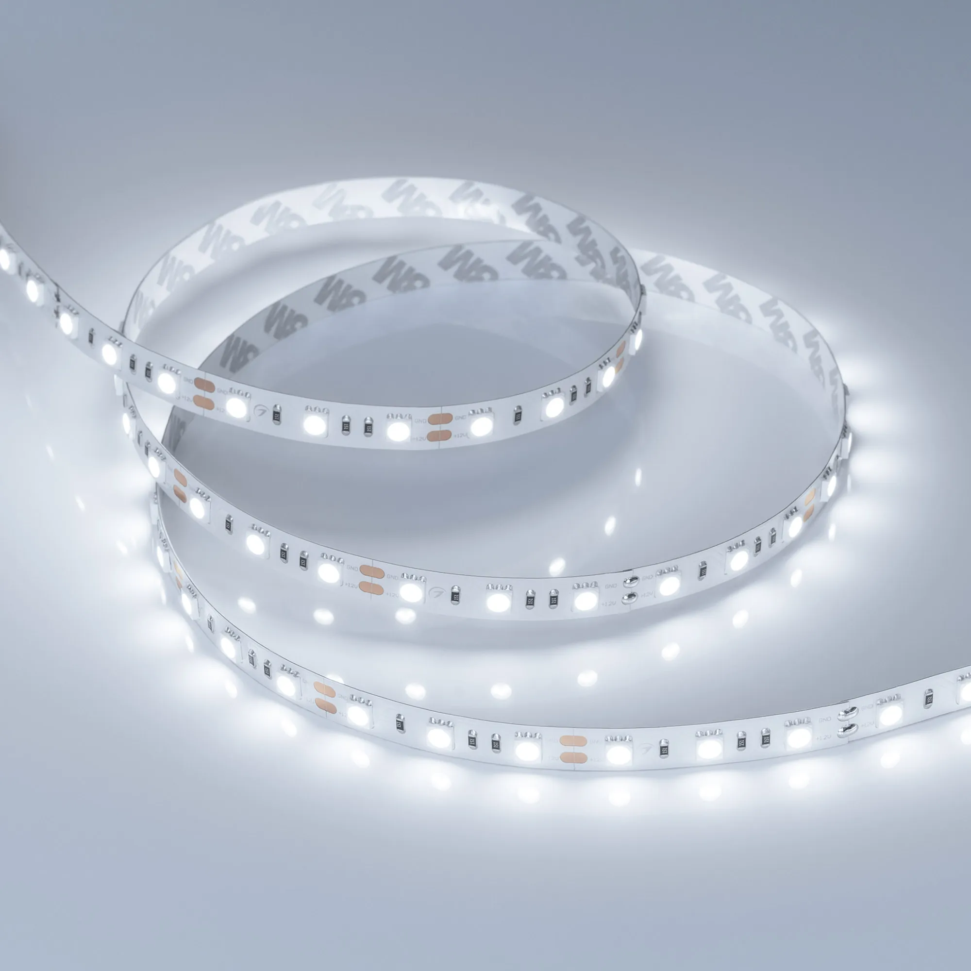 Светодиодная лента RT серии B60. Светодиоды SMD 5060, 60 шт/м, белая плата шириной 10 мм, скотч 3M. Цвет ХОЛОДНЫЙ 8000K, индекс цветопередачи CRI>85, угол 120°. Питание 12 В, мощность 14.4 Вт/м (72 Вт на 5 м). Размеры 5000x10x2.2мм. Мин. отрезок 50 мм, 3 светодиода. Цена за 1 м. Обязательна установка на профиль.