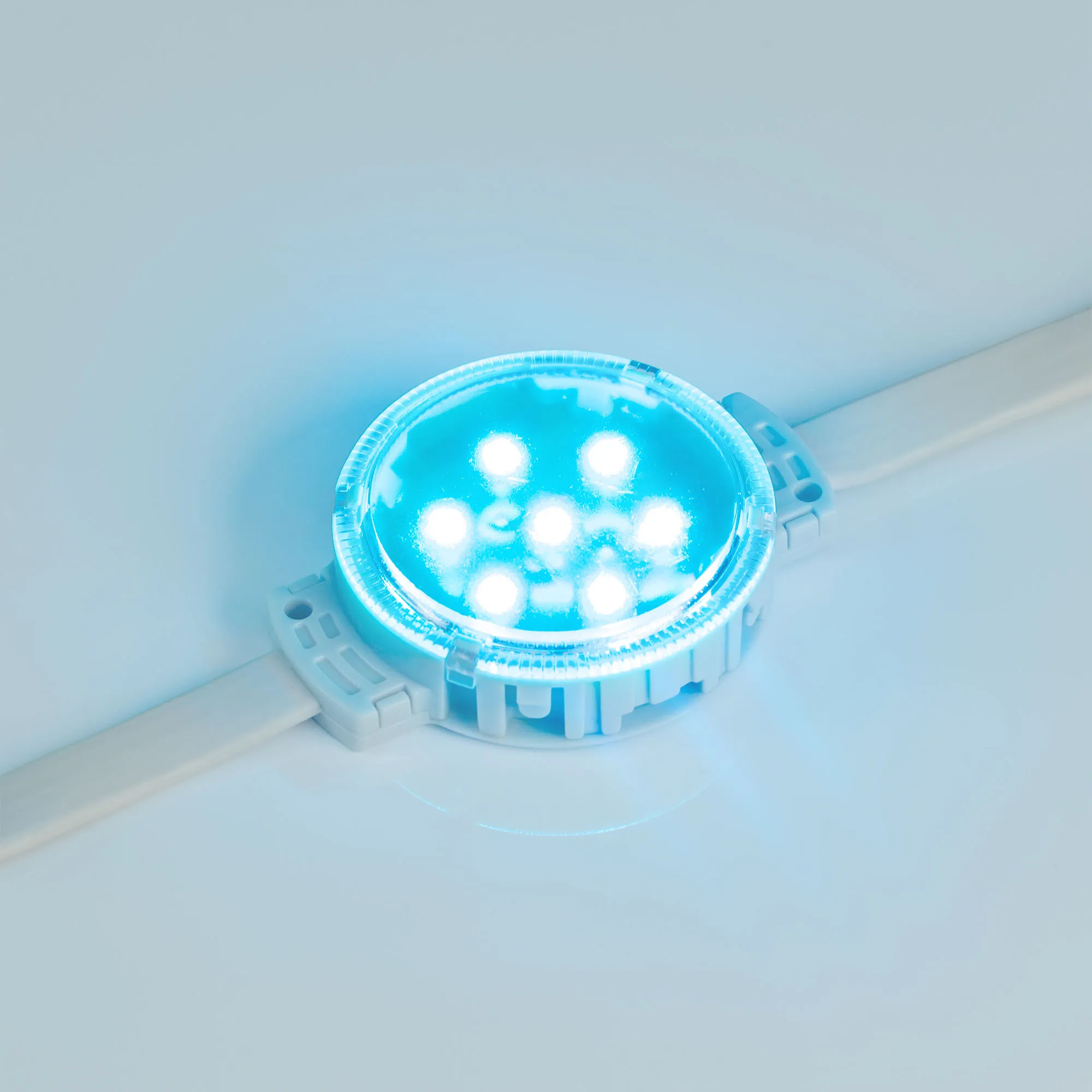 Управляемый светодиодный модуль SPI, RGB, микросхема MT26803 (аналог UCS1903), напряжение 24 В, мощность 1.25 Вт, 7 светодиодов SMD 3535, угол 120°. Создание медиафасадов, 30 шт на проводе, расстояние между центрами модулей 170 мм, длина провода между модулями 110 мм. Степень пылевлагозащиты IP68. Размер Ø50×66×16 мм. Гарантия 3 года.