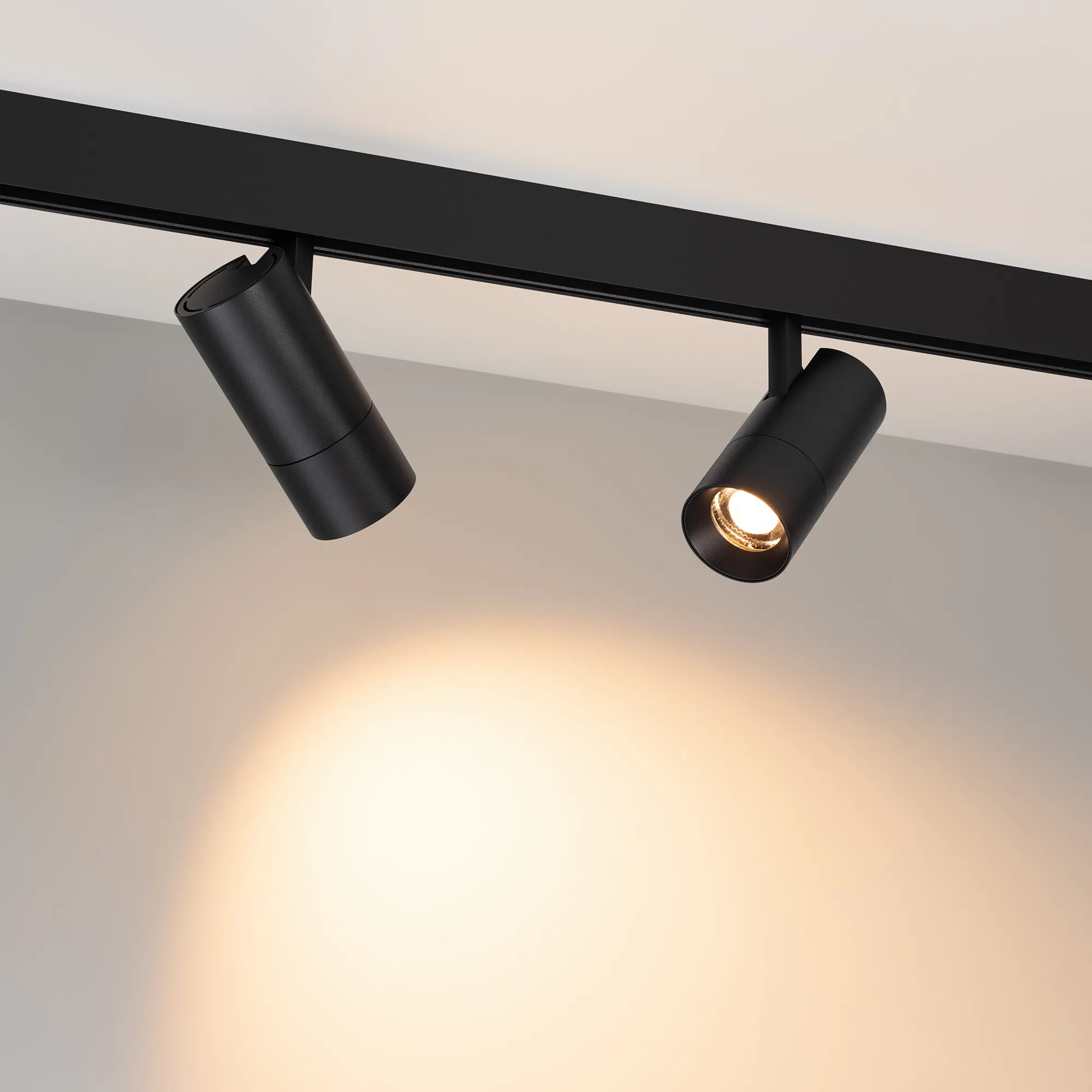 Светильник для магнитных треков MAG-ORIENT шириной 26 мм. Мощность 15 Вт, св. поток 1100 лм, 85 лм/Вт, теплый 3000 K, CRI>94, угол 34-60°, напряжение питания 48 В. Черный фигурный корпус из металл, экран поликарбонат, степень защиты IP20. Размеры LxWxH 204x66x211 мм.