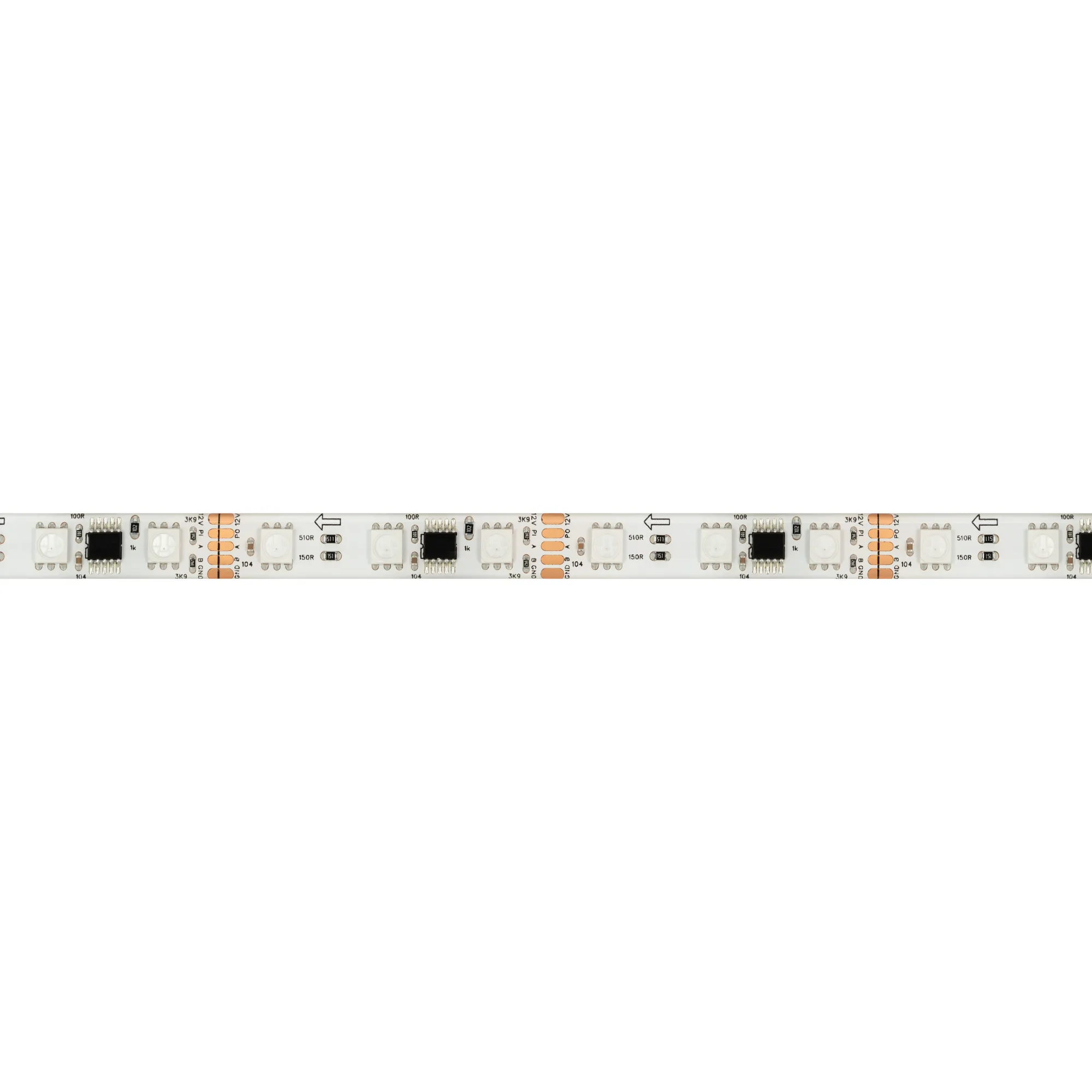 Светодиодная герметичная лента DMX серии B60 с микросхемой GS8516 (GS8526), IP65 (SE - силиконовый верхний слой). Светодиоды SMD 5060, 60 шт/м, 20 pixels на 1 м (100 pixels на 5 м), 1 pixel = 3 светодиода, белая плата шириной 10 мм, скотч 3М. Цвет RGB, угол 120°. Питание 12 В, мощность 14 Вт/м (70 Вт на 5 м). Размеры 5000x10x4 мм. Мин. отрезок 50 мм, 3 светодиода. Цена за 1 м.