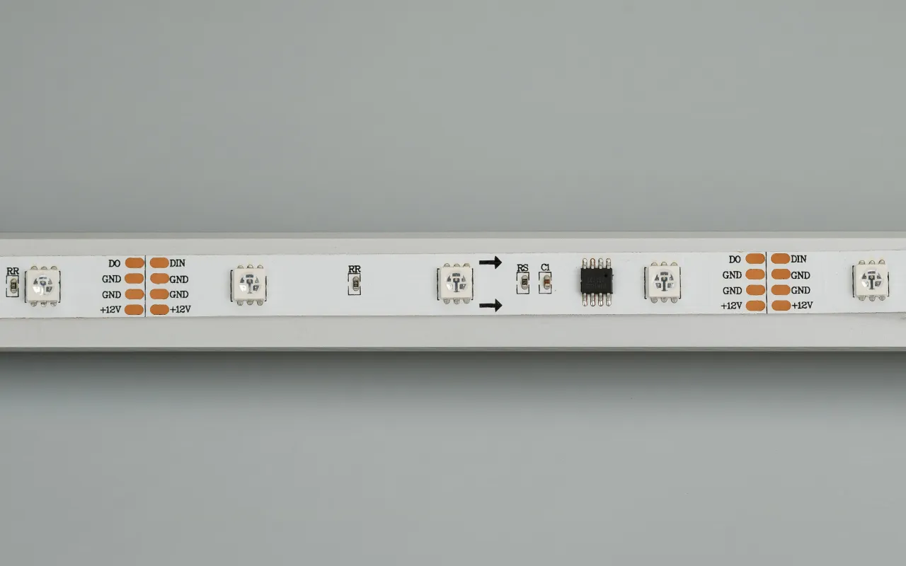 Лента «Бегущие огни», открытая IP20, с микросхемой 1804, встроенный в ленту контроллер с автозапуском 300 программ (Auto mode) и подкл-ем внеш. контроллера. Длина 5м, 150шт LED RGB 5060, 10 pixel/m (1 pixel = 3 LED). Питание 12V, ном. мощн. 5 Вт/м, макс. мощн-ть 6,5 Вт/м (статический белый цвет). Ширина 10 мм. Негерметичные прямоугольные коннекторы.