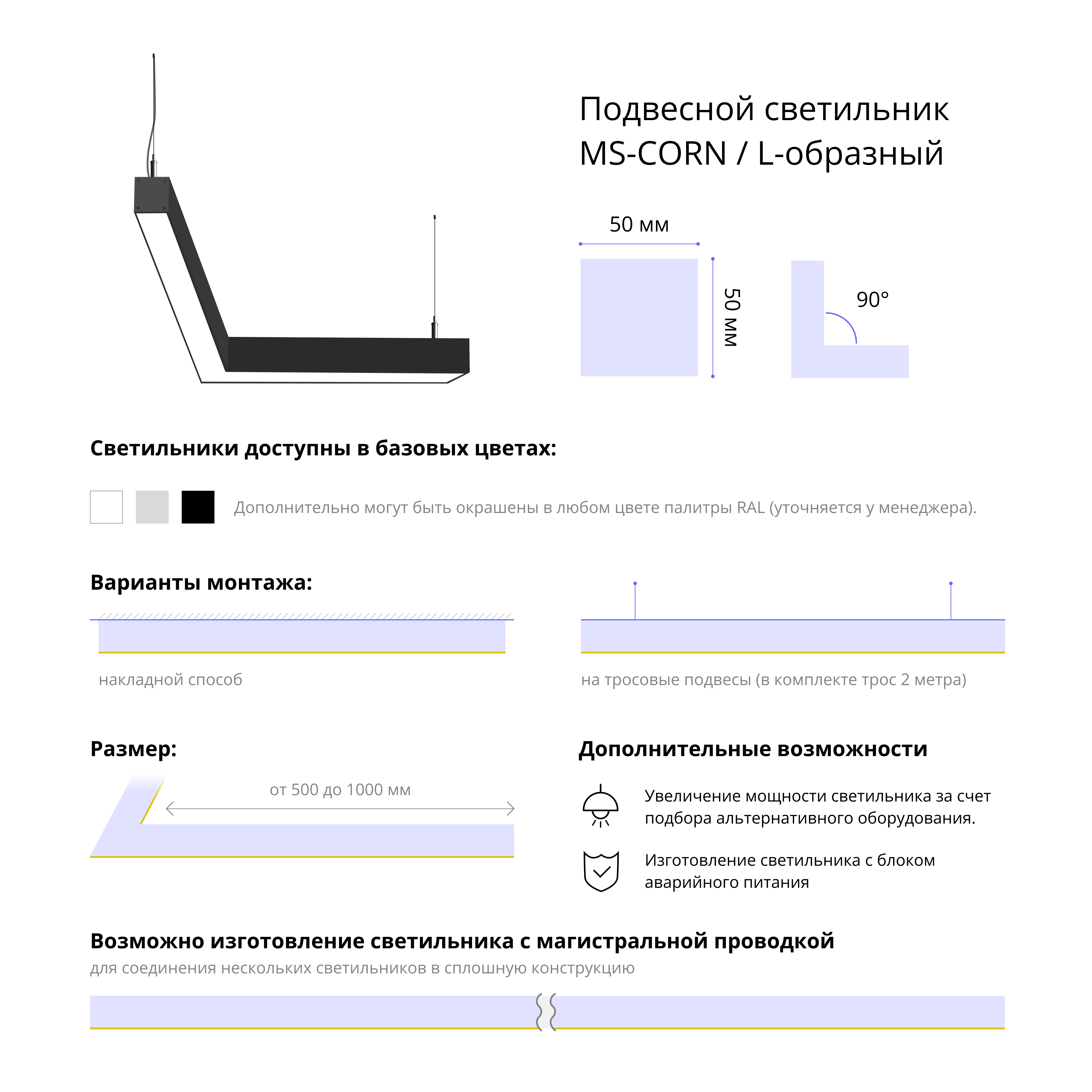 Светодиодный фигурный светильник MS-CORN L-образный 90гр. размер профиля 50х50mm длиной 750х750mm мощностью 60W. Светильник собирается в алюминиевом корпусе с матовым рассеивателем, который дает равномерную засветку по всей площади.