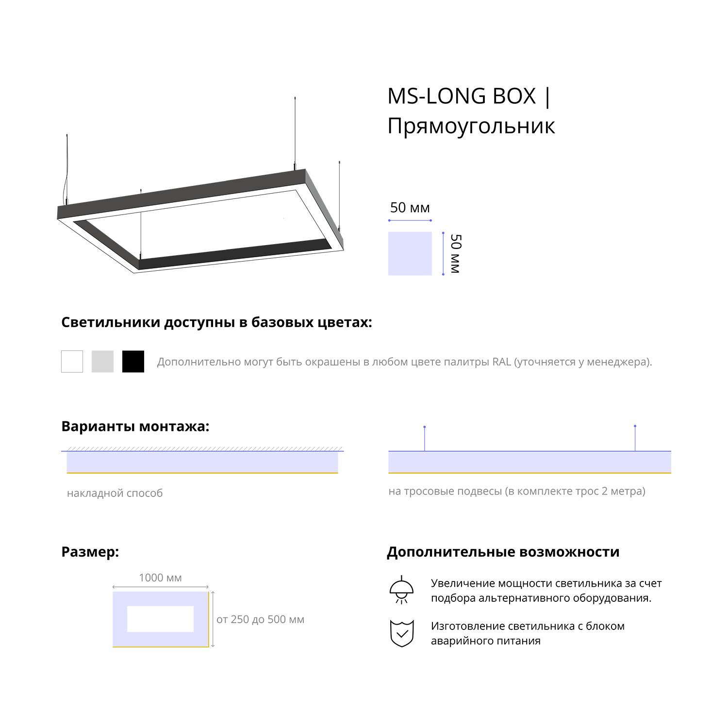 Cветодиодный фигурный светильник MS-LONG BOX Прямоугольник размер профиля 50x50мм длиной 1000х500мм мощностью 110W. Светильник собирается из алюминиевого основния с матовым рассеивателем, который дает равномерную засветку по всей площади.