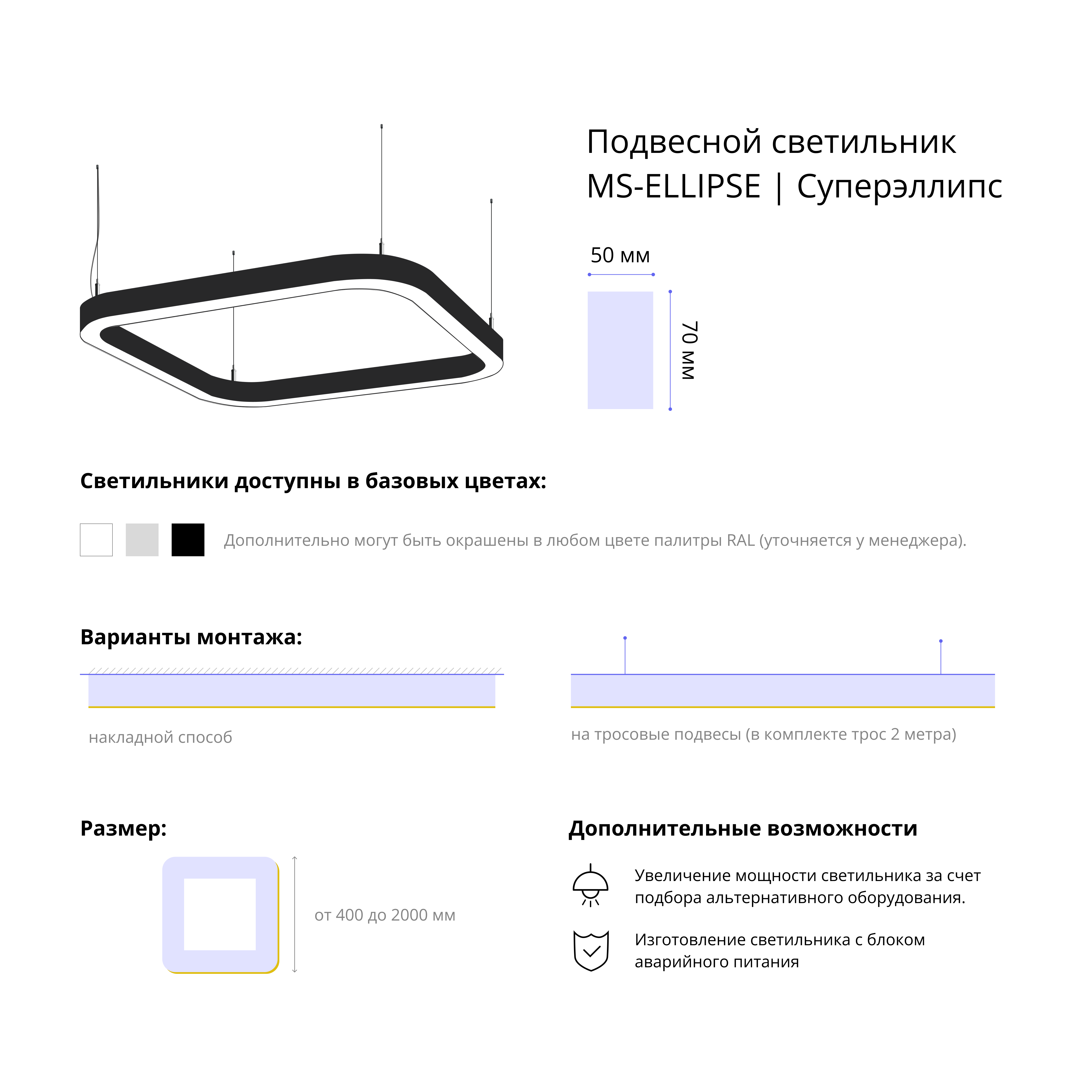 - Варианты монтажа: на тросовые подвесы (в комплекте трос 2 метра) и накладным способом.