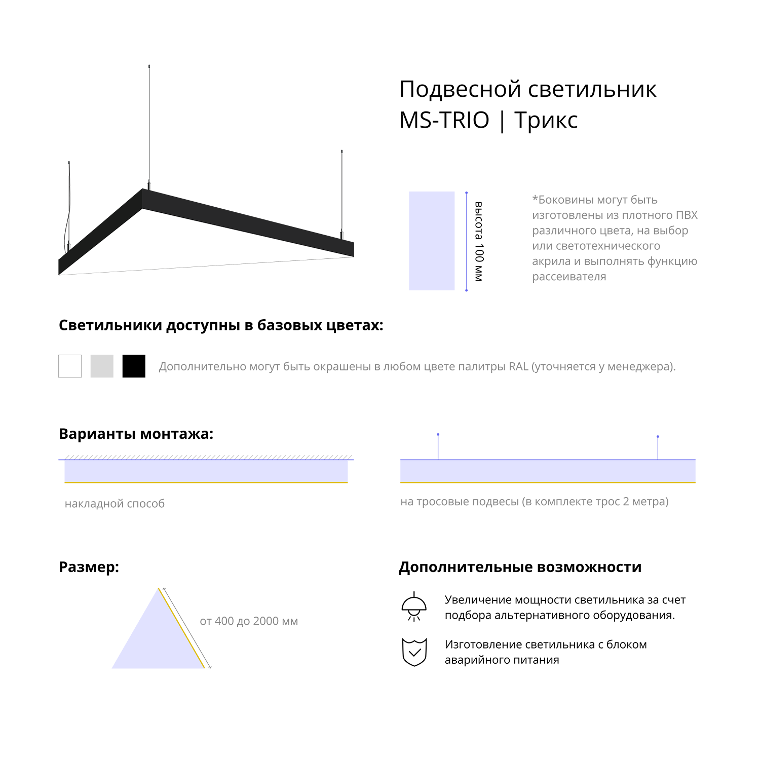 Cветодиодный фигурный светильник MS-TRIO Трикс длиной 1100мм мощностью 67W. Светильник собирается из алюминиевого основния с матовым рассеивателем, который дает равномерную засветку по всей площади.