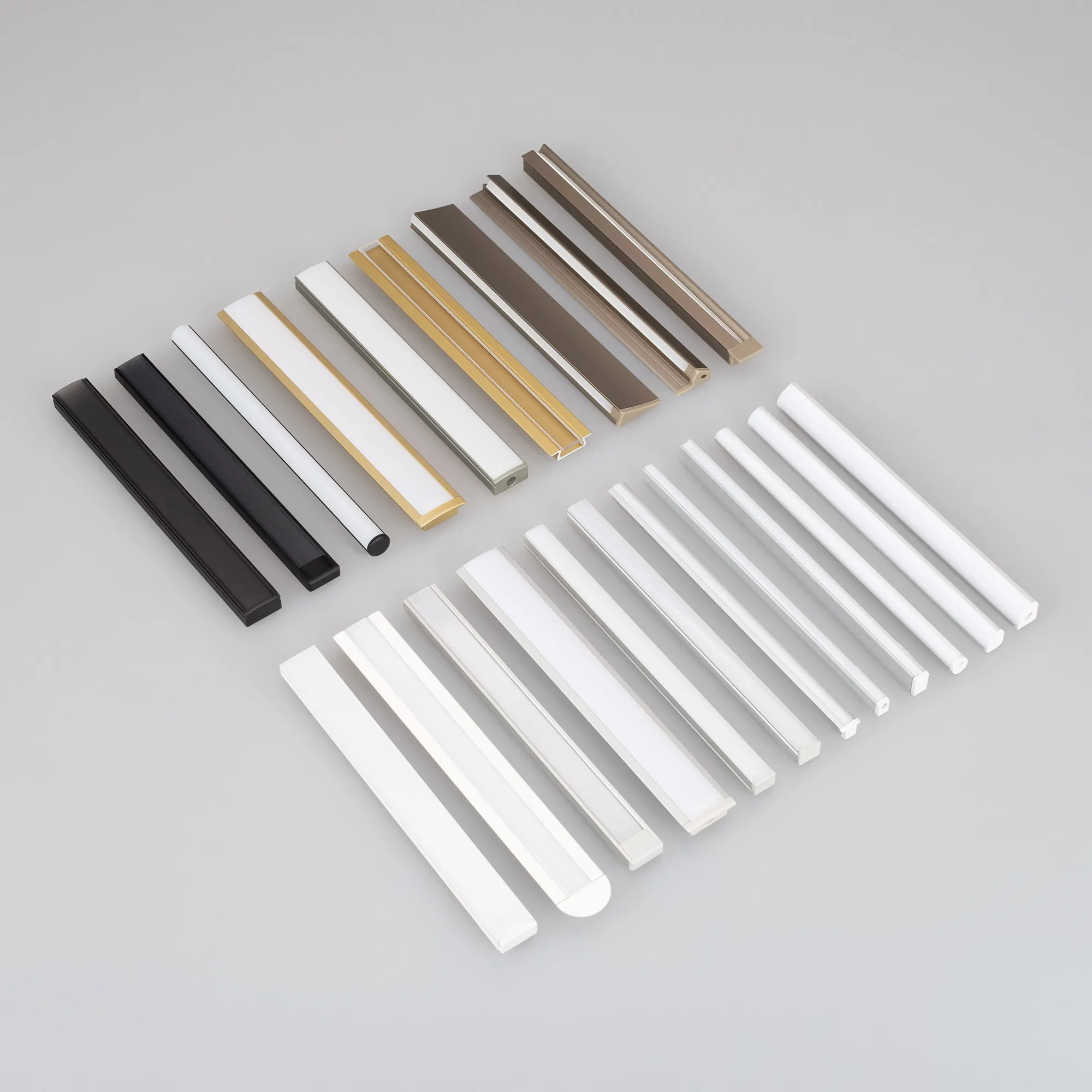 Набор образцов мебельных профилей ARLIGHT с экранами и заглушками.