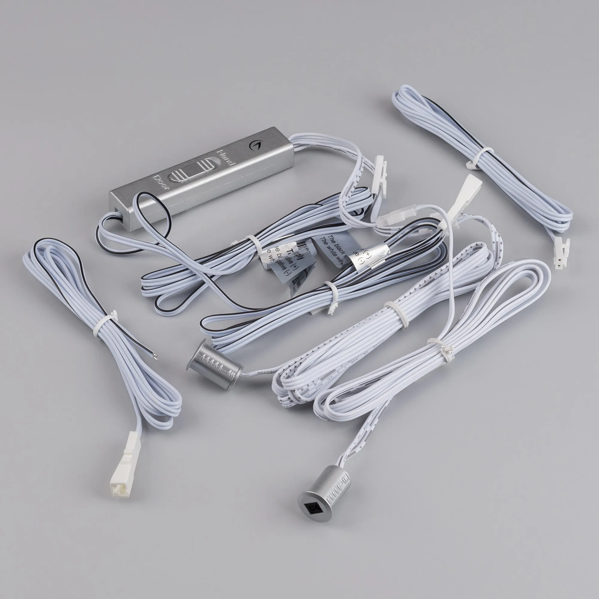 Выключатель для светодиодной ленты 12-24 В. В комплекте 2 датчика. Питание/рабочее напряжение DC 12-24 В, максимальный ток 4 A на канал, 1 канал, максимальная мощность 48-96 Вт. Реагирует на открывание дверей или движение рукой, переключатель между режимами «hand» - «door» расположен на корпусе блока управления. Расстояние срабатывания до 10 см, датчик открыт — «вкл», закрыт — «выкл». Габаритные размеры блока управления: 75 х 15 х 11 мм, кабель 1 м (у датчика), кабель 25 см (питание). Габаритные размеры датчика: 11 х 18 мм, врезное отверстие Ø 11 мм.