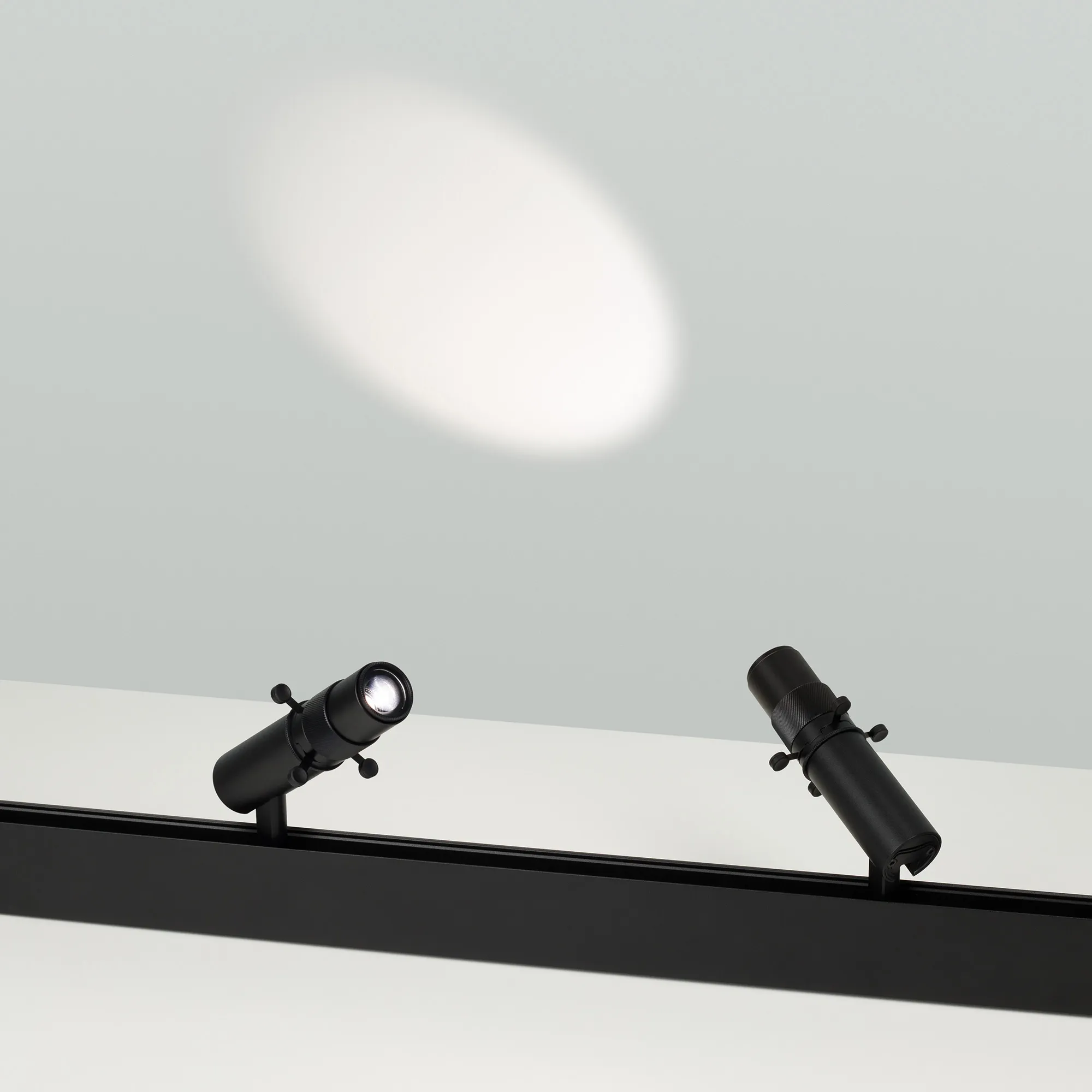 Светильник с кадрируемой оптикой и изменяемым углом для магнитных треков MAG-ORIENT шириной 26 мм. Мощность 6 Вт, св. поток 75-130 лм, 22 лм/Вт, дневной 4000 K, CRI>98, угол 19-29°, напряжение питания 48 В. Черный фигурный корпус из металла, степень защиты IP20. Размеры LxWxH 126x35x195 мм. Длина светоизлучающего модуля 140мм. Монтаж на трек MAG-ORIENT. Пульсация <1%.