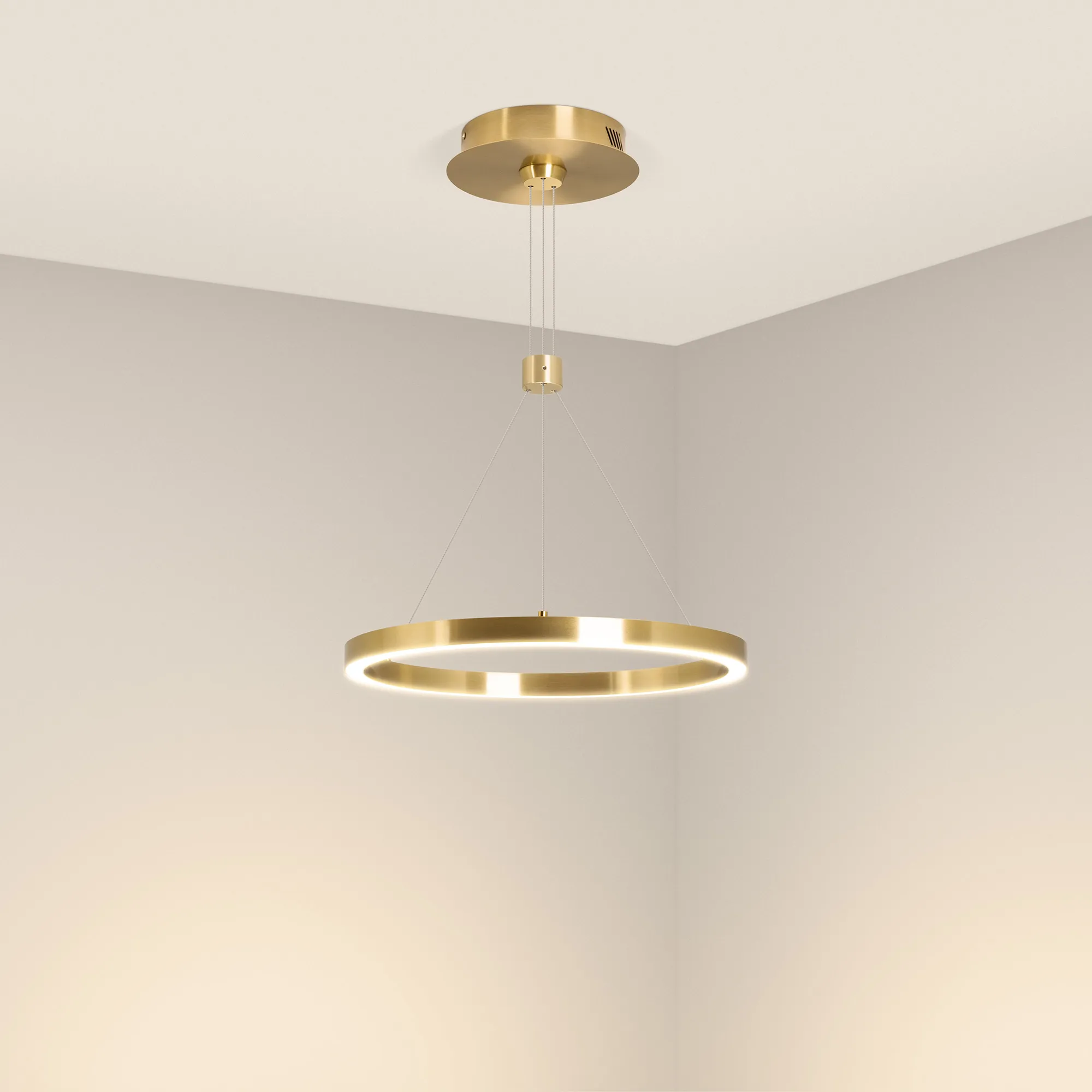 Подвесной светильник. Мощность 24 Вт, св. поток 1380 лм, 58 лм/Вт, дневной 4000 K, CRI>90, угол 120°, напряжение питания 230 В. Золотистый круглый корпус из алюминия, экран силикон, степень защиты IP20. Размер: диаметр 400 мм, высота 25 мм, ширина профиля 25 мм, размер чаши: диаметр 170 мм, высота 40 мм. Монтаж подвесной, длина подвеса 1200мм. Драйвер 33-40 В, 600 мА Пульсация <5%.