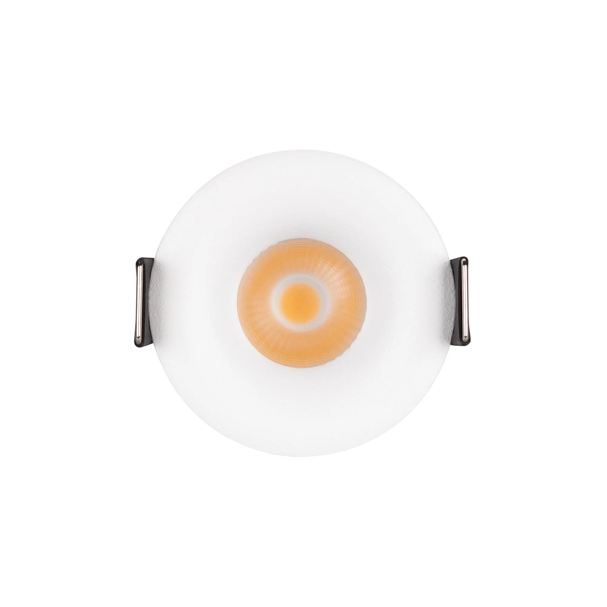 Встраиваемый светильник даунлайт. Мощность 5 Вт, св. поток 400 лм, 80 лм/Вт, тёплый 3000 K, CRI>90, угол 36°, напряжение питания 230 В. Белый круглый корпус из алюминия, экран PMMA, степень защиты IP54. Размер: диаметр 45 мм, высота 43 мм. Монтаж встраиваемый, установочное отверстие: диаметр 35 мм. Драйвер IP54, 8-12 В, 400 мА, пульсация <1%.