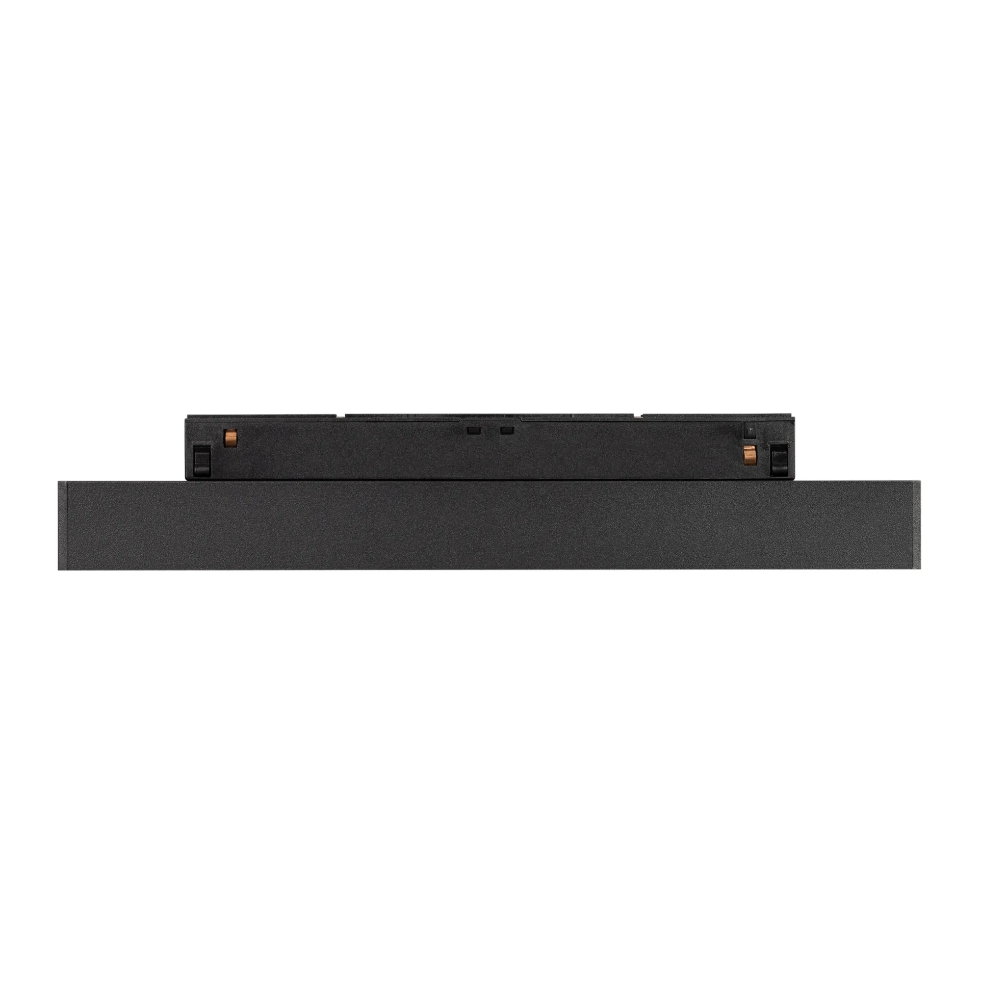 Светильник для магнитных треков MAG-ORIENT шириной 26 мм. Мощность 8 Вт, св. поток 360 лм, 45 лм/Вт, теплый 2700 K, CRI>90, угол24°, напряжение питания 48 В. Черный прямоугольный корпус из металла, экран поликарбонат, степень защиты IP20. Размер: длина 235 мм, ширина 22 мм, высота 42 мм. Монтаж на трек MAG-ORIENT. Пульсация <1%.