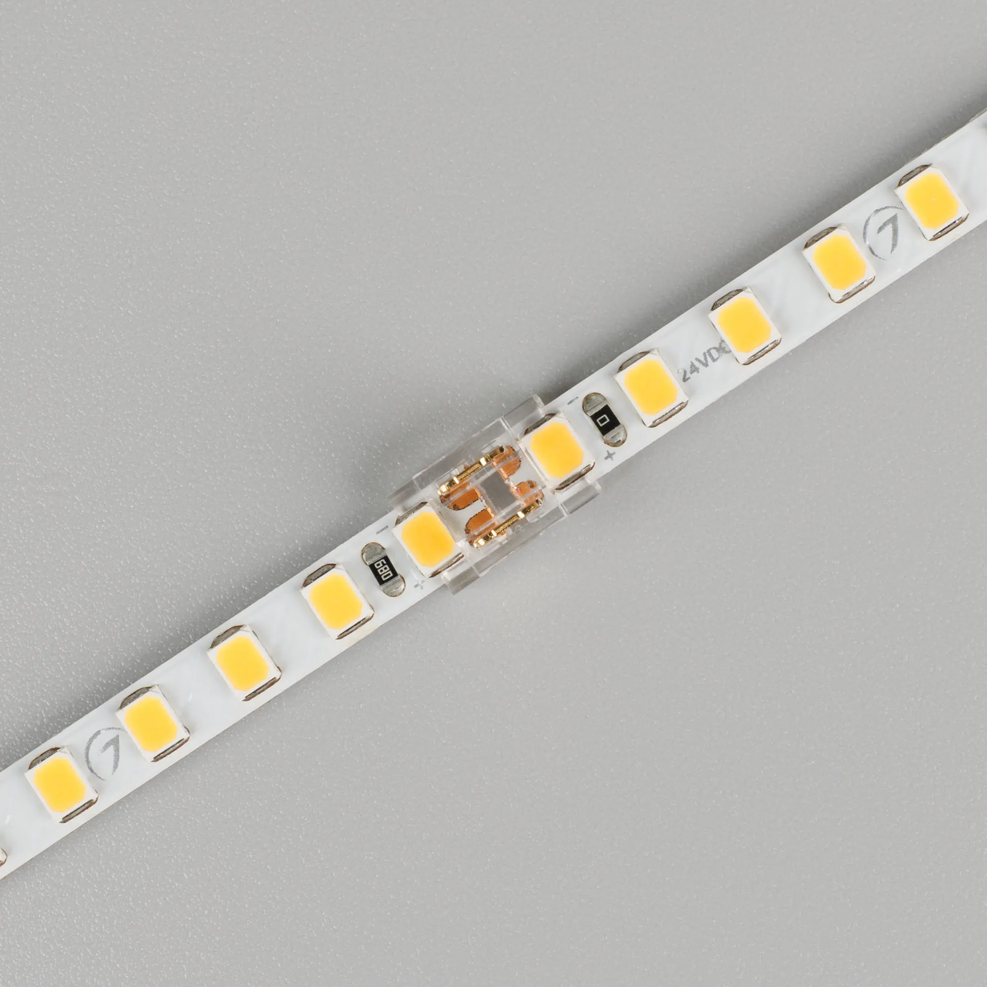 Одиночный коннектор для соединения 2-х отрезков открытых светодиодных одноцветных лент (2216, 2835, COB) шириной 5 мм. Материал - прозрачный пластик. Обеспечивает соединение без видимых разрывов. Максимальный допустимый ток 3 А, максимальное напряжение 24 В, степень защиты IP20. Цена за 1шт, 10шт/пакет.