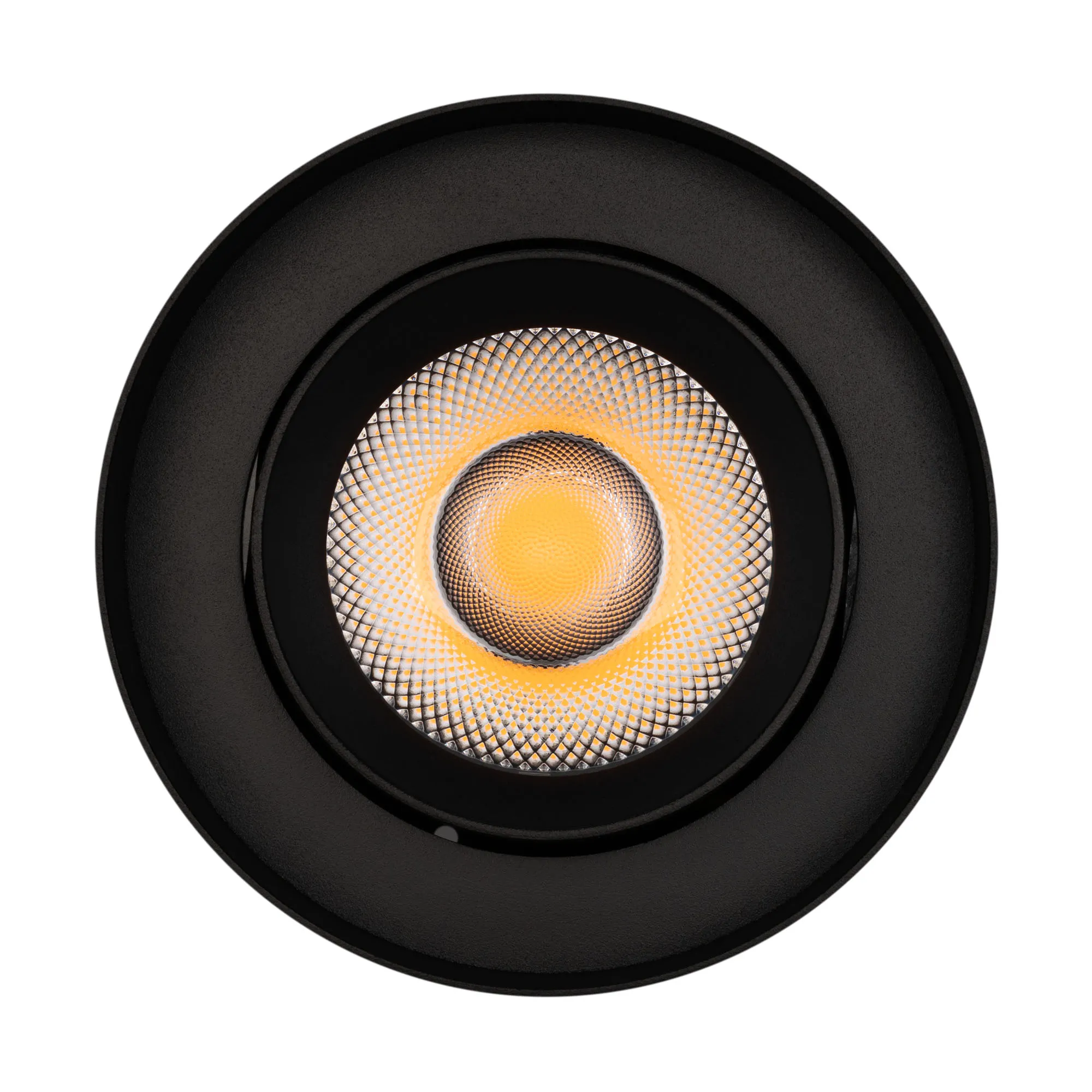 Накладной интерьерный светильник. Мощность 24 Вт, св. поток 2400 лм, 99 лм/Вт, теплый 3000 K, CRI>90, угол 36°, регулируемое направление луча 40°(20+20), поворотный световой модуль вокруг своей оси на 340°, UGR <11, напряжение питания 230 В. Чёрный круглый корпус из алюминия, степень защиты IP54. Размер: диаметр 132 мм, высота 165 мм. Монтаж накладной. Драйвер 27-45 В, 600мА, пульсация <1%.