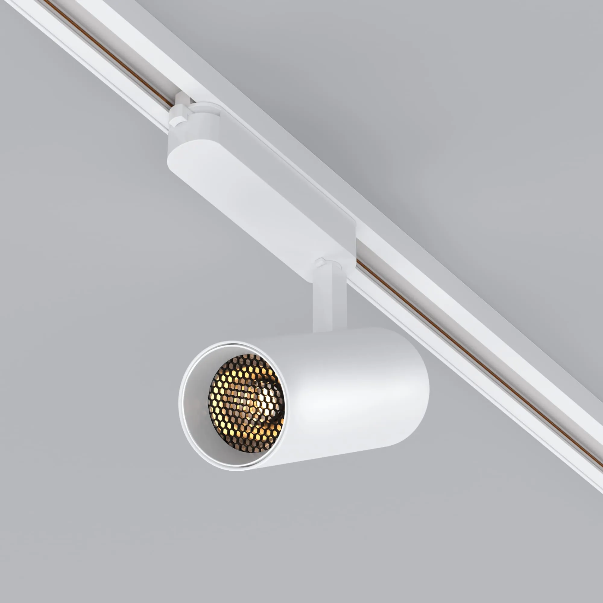 Светильник для треков/шин 2 провода. Мощность 15 Вт, св. поток без решетки honeycomb 1500 лм, 100 лм/Вт, с решеткой honeycomb 990 лм, 66 лм/Вт, дневной 4000 K, CRI>90, угол 55°, напряжение питания 230 В. Белый круглый корпус из алюминия, материал линзы PMMA, степень защиты IP20. Размер: диаметр 60 мм, длина световой части 141 мм. Монтаж на трек 1-фазный. Драйвер встроенный 350 мА 25-40 В, пульсация <5%.