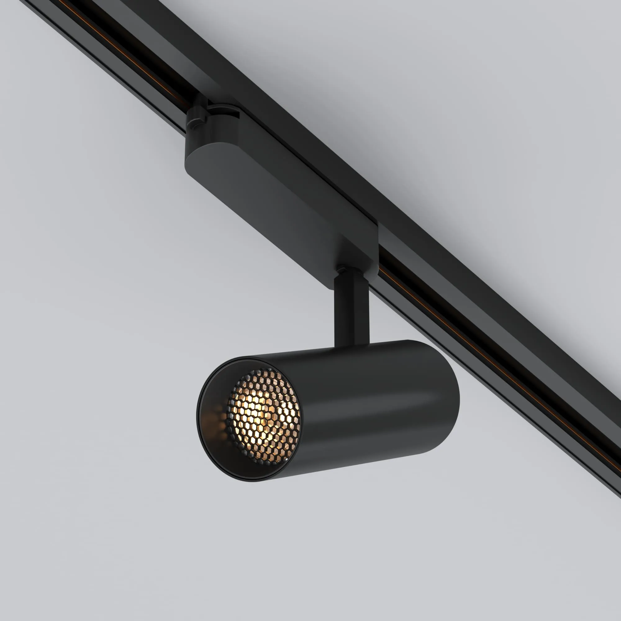 Светильник для треков/шин 2 провода. Мощность 10 Вт, св. поток без решетки honeycomb 1000 лм, 100 лм/Вт, с решеткой honeycomb 660 лм, 66 лм/Вт, дневной 4000 K, CRI>90, угол 55°, напряжение питания 230 В. Черный круглый корпус из алюминия, материал линзы PMMA, степень защиты IP20. Размер: диаметр 55 мм, длина световой части 141 мм. Монтаж на трек 1-фазный. Драйвер встроенный 25-40 В, 250мА., пульсация <5%.
