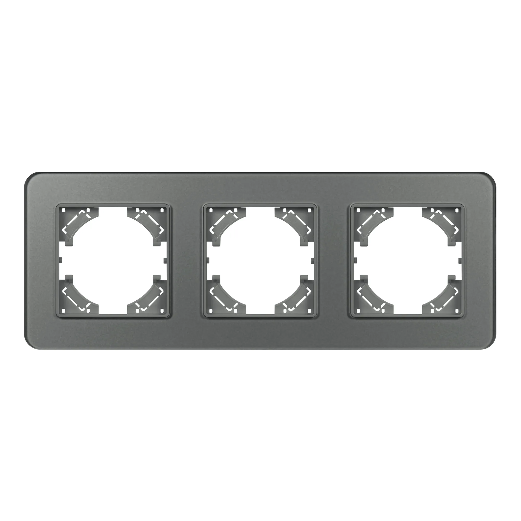 Рамка стеклянная на 3 поста, под встраиваемый механизм. Цвет - серый с Soft-Touch покрытием. Среднего уровня герметичности IP20. Ориентация монтажа - горизонтальная (основным ориентиром служат посадочные выступы для накладки механизма).