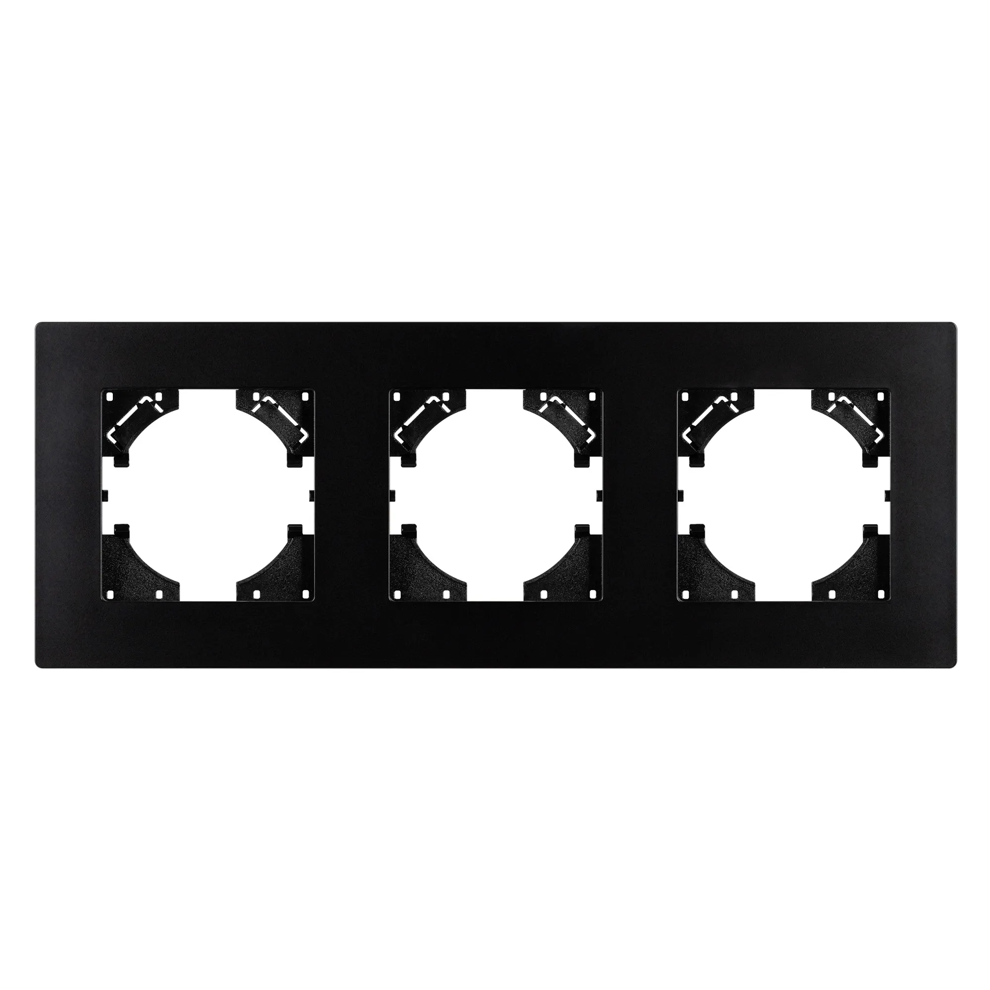 Рамка пластиковая на 3 поста, под встраиваемый механизм. Цвет - черный. Среднего уровня герметичности IP20. Ориентация монтажа - горизонтальная (основным ориентиром служат посадочные выступы для накладки механизма).