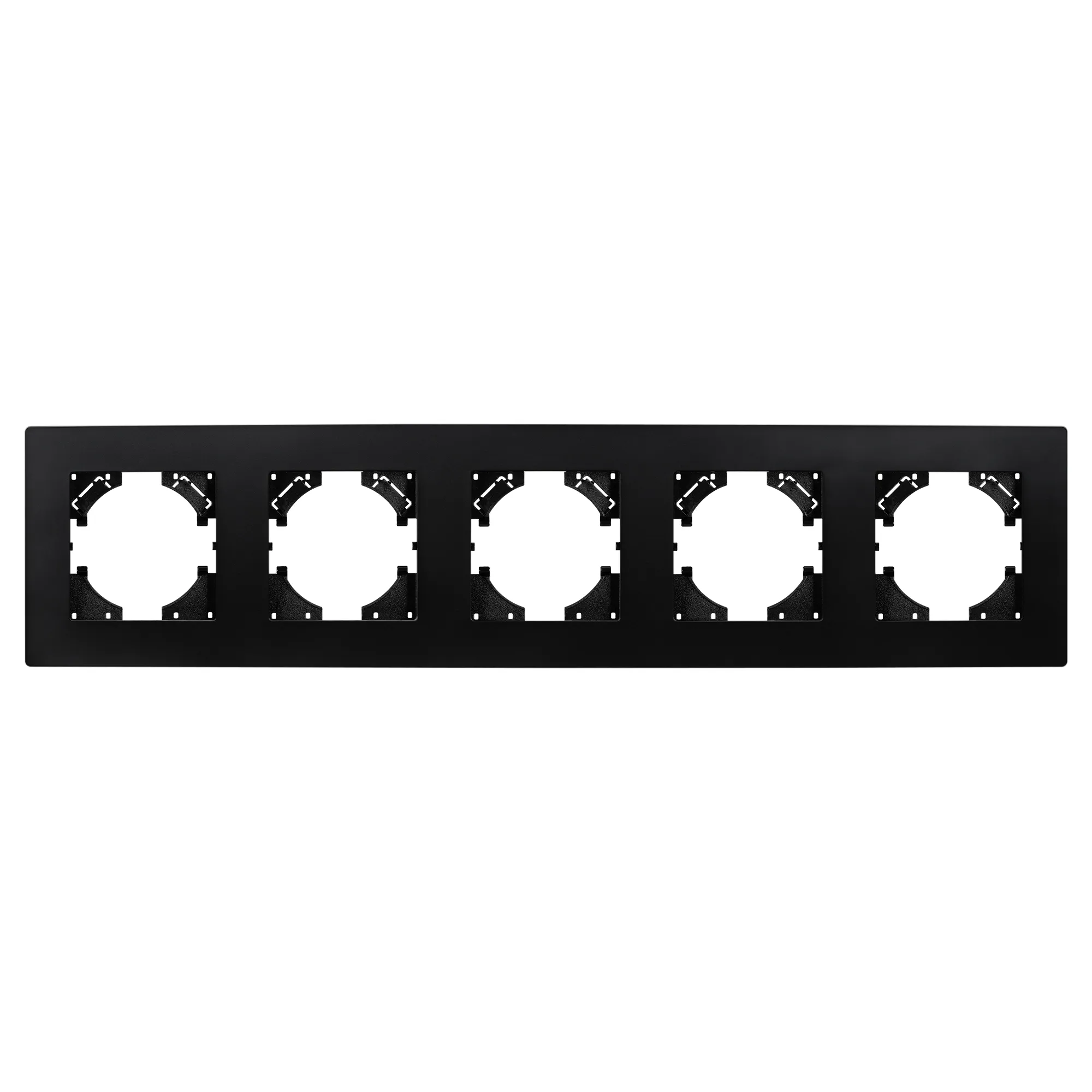 Рамка пластиковая на 5 постов, под встраиваемый механизм. Цвет - черный. Среднего уровня герметичности IP20. Ориентация монтажа - горизонтальная (основным ориентиром служат посадочные выступы для накладки механизма).