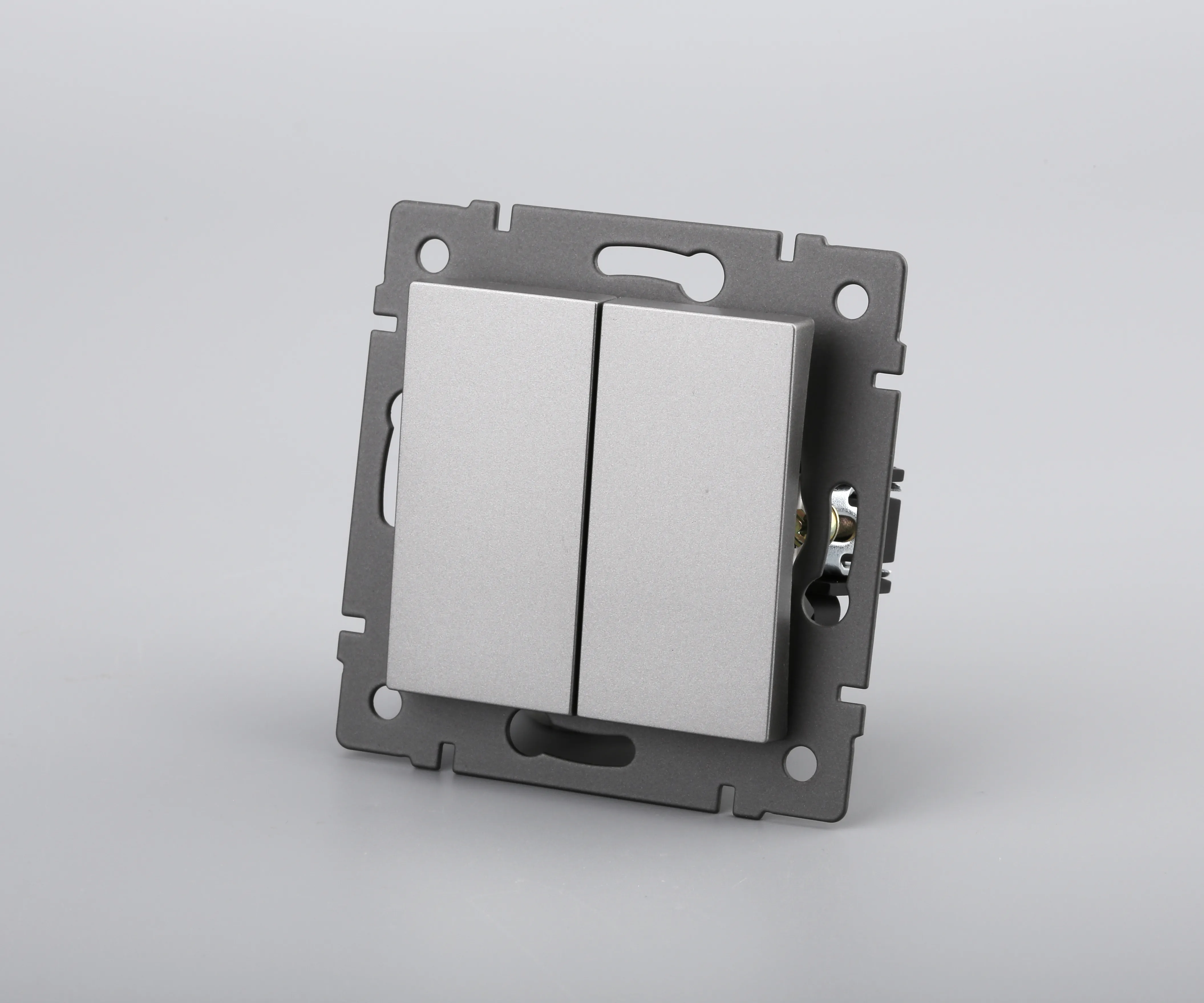 Механизм выключателя света клавишный на 1 пост 2 возвратные клавиши. Цвет - серый. Без фронтальной рамки. Уровень пылевлагозащиты IP20. Выключатель устанавливается в стандартный круглый подрозетник.