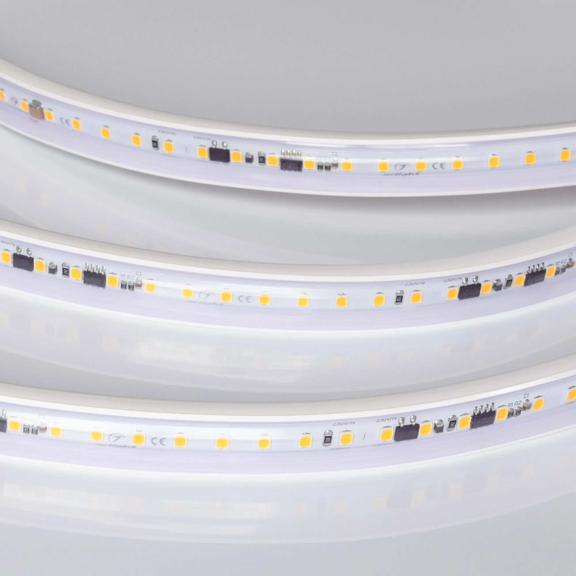 Светодиодная герметичная лента ARL серии A120, IP65 (PVC - трубка ПВХ экструзия). Светодиоды SMD 2835, 120 шт/м, белая плата шириной 12 мм, крепление на силиконовые скобы (скотч 3M отсутствует). Цвет БЕЛЫЙ 6000K, индекс цветопередачи CRI>85, угол 120°. Питание 230 В, мощность 15 Вт/м (750 Вт на 50 м). Размеры 50000x15x6.5 мм. Мин. отрезок 100 мм, 12 светодиодов. Цена за 1 м.
