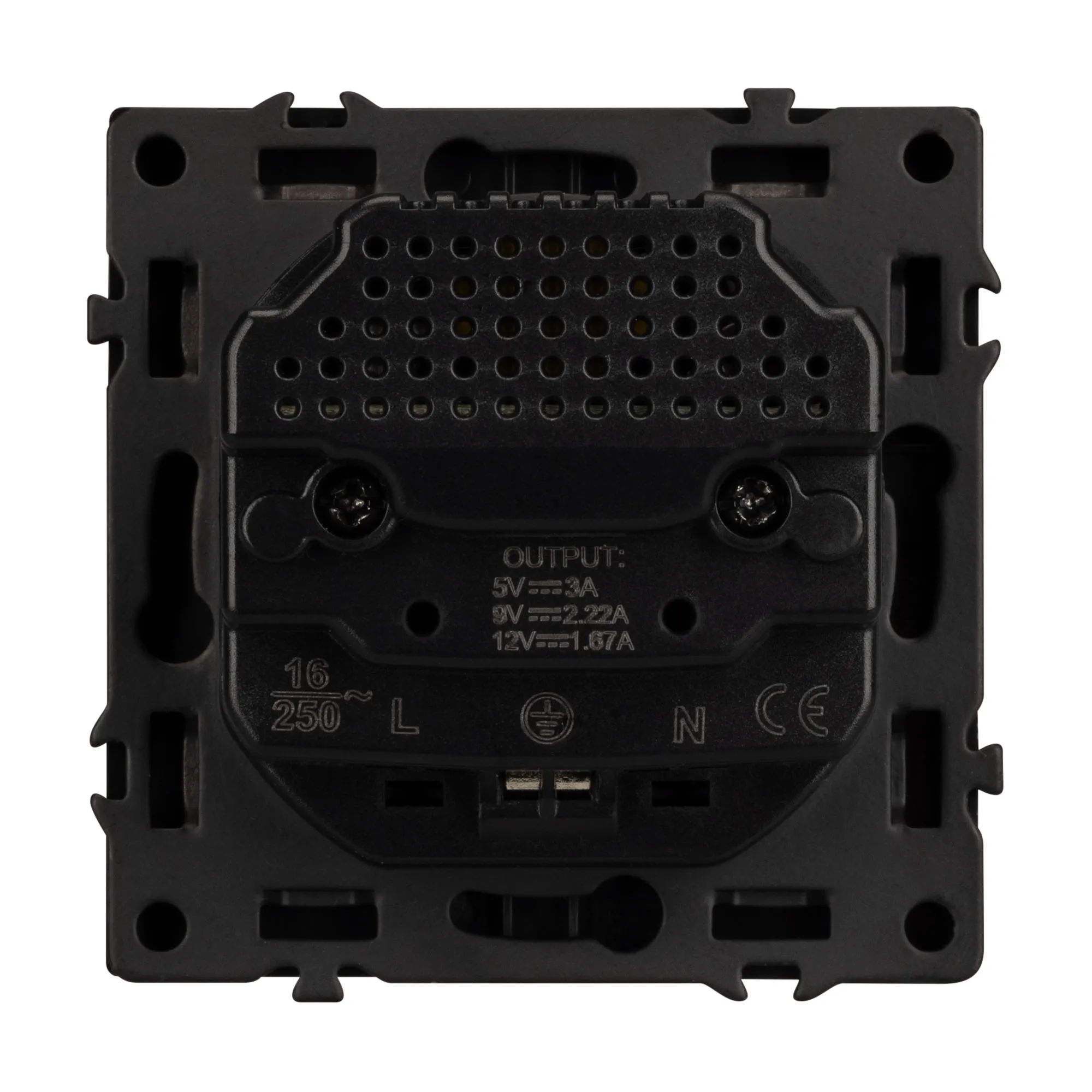 Механизм розетки с заземлением 1 пост и 2 USB Type A+C порта. Цвет - черный, с Soft-Touch покрытием. Без фронтальной рамки. Уровень пылевлагозащиты IP20. Розетка устанавливается в стандартный подрозетник круглого сечения диаметром 60мм.