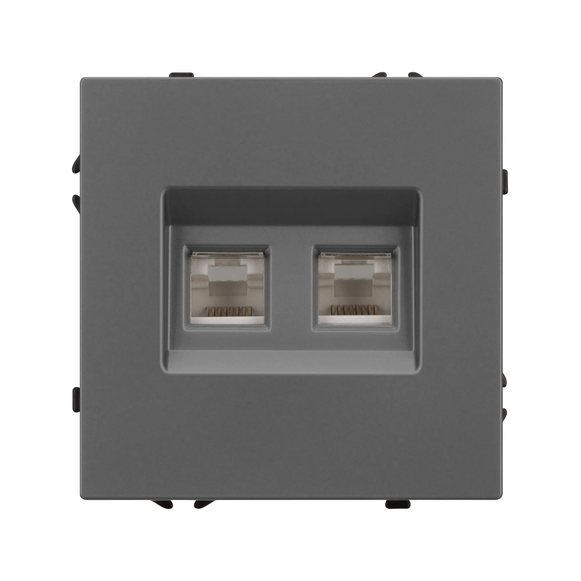 Механизм компьютерной розетки на 2 поста 6-й категории. Цвет - серый, с Soft-Touch покрытием. Без фронтальной рамки. Уровень пылевлагозащиты IP20. Тип подключаемого разъема - RJ45. Розетка устанавливается в стандартный подрозетник круглого сечения диаметром 60мм.