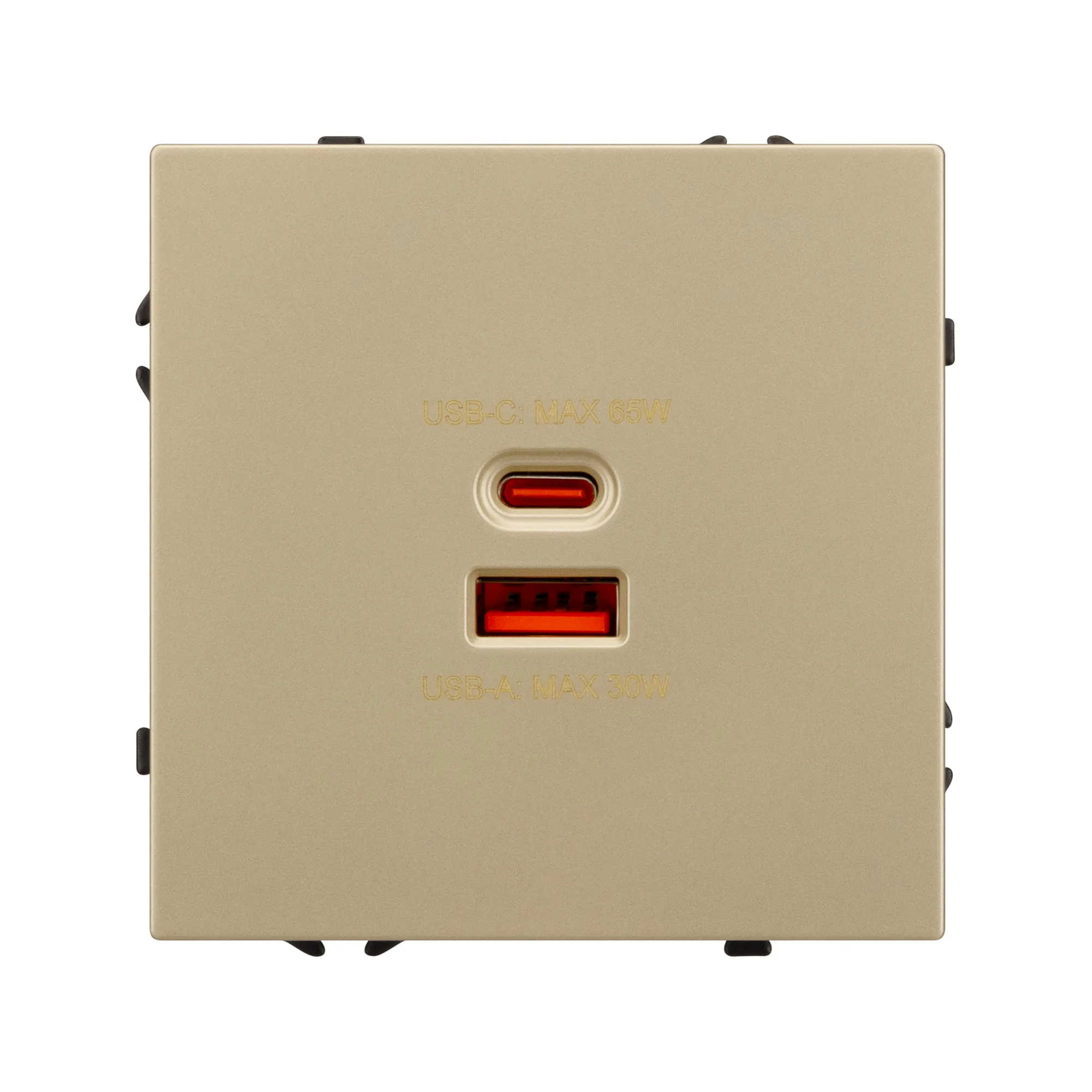 Механизм розетки с быстрой USB зарядкой на 2 порта. Цвет - золотой, с Soft-Touch покрытием. Без фронтальной рамки. Уровень пылевлагозащиты IP20. Тип подключаемого разъема - USB Type A + Type C. Устанавливается в стандартный подрозетник круглого сечения диаметром 60мм.