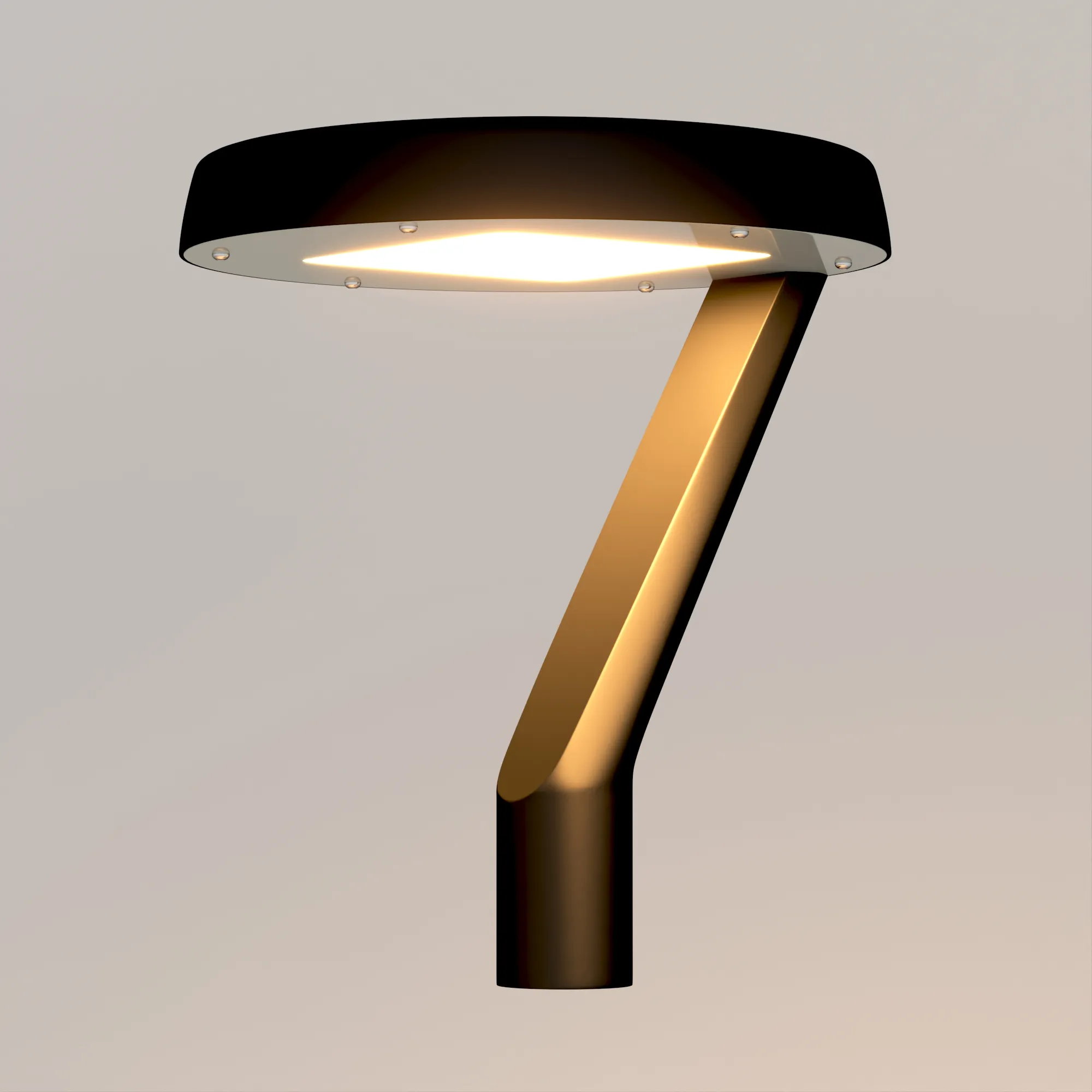 Венчающий светодиодный светильник. Мощность 50 Вт, св. поток 7100 лм, 141 лм/Вт, тёплый 3000 K, CRI>80, угол 145x40°, напряжение питания 230 В. Черный корпус из алюминия, экран закаленное стекло, степень защиты IP65. Размер: диаметр 510 мм, высота 480 мм. Монтаж на вертикальную опору диаметром 76 мм.